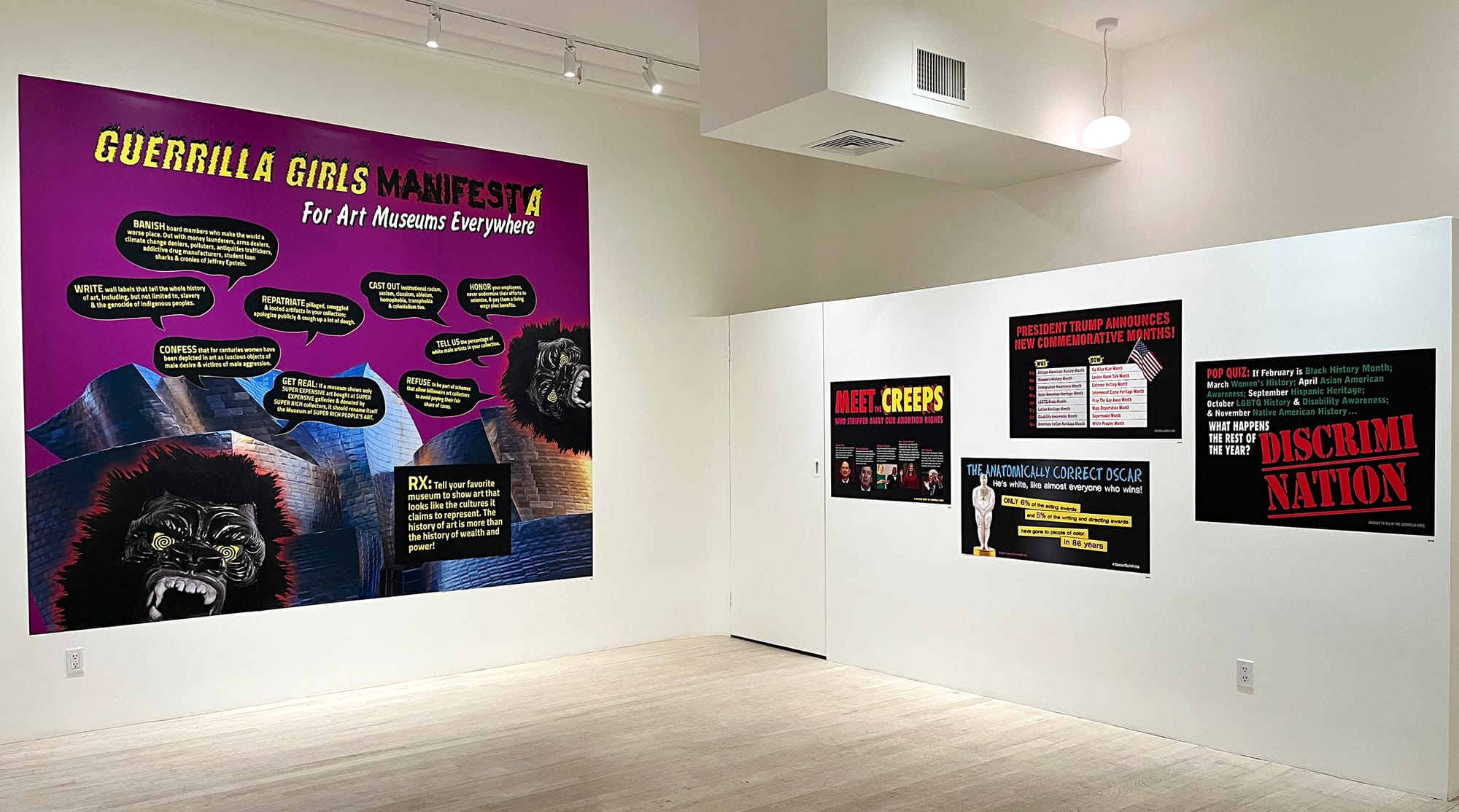 While their message has remained consistent, it has expanded to address more of the persistent issues facing the art world. For instance, the nearly 10-by-10-foot poster that anchors the show, "Guerrilla Girls ManifestA: For Art Museums Everywhere" (2024), features their iconic gorilla masks snarling atop a photo of the Guggenheim Bilbao in Spain. This work encourages viewers themselves to determine the percentage of work by White male artists in museums, to pay attention to funding sources, to support museum workers, to repatriate stolen artifacts, and to "Tell your favorite museum to show art that looks like the culture it claims to represent."