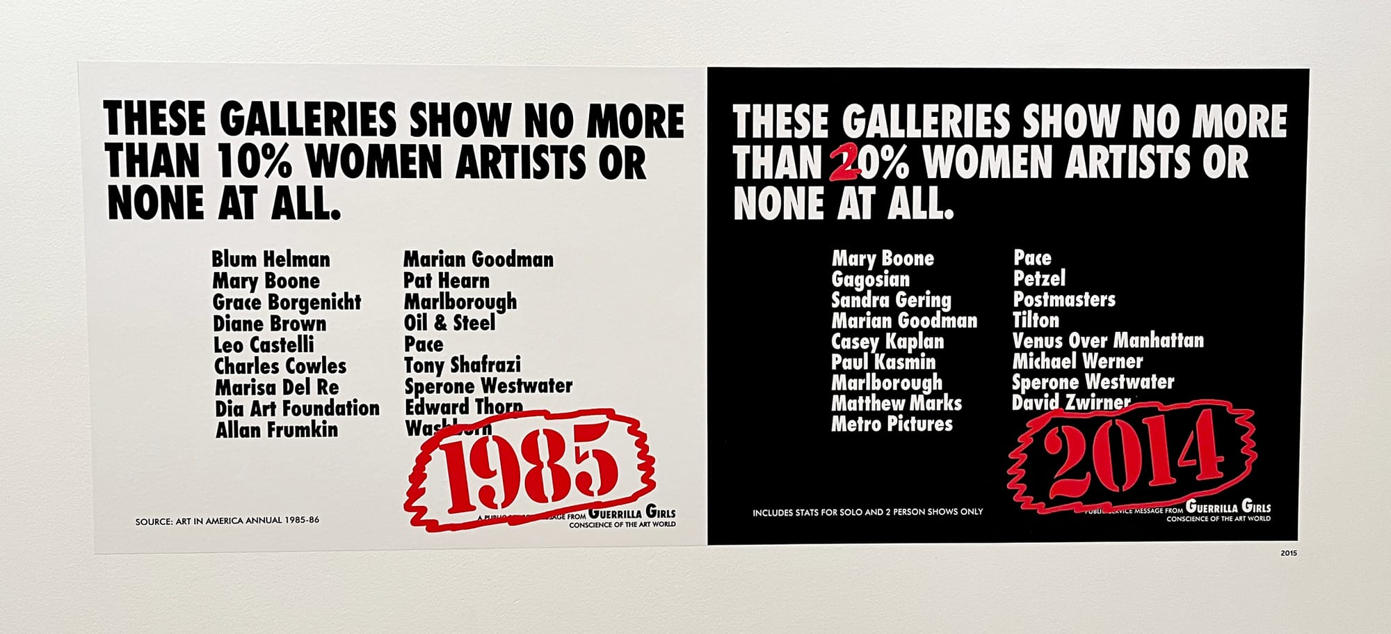 In their earliest actions, they wheat-pasted black and white posters around the Lower East Side and Soho in New York City. The work was characterized by bold, advertising-inspired typography and statistical evidence of the lack of art by women appearing in the city's galleries and museums. Soon after, they brought their message directly into exhibition spaces, organizing a show of artwork by women at the Palladium Dance Club in 1985, and in 1987, participating in two gallery shows — including one in which they skewered the Whitney Biennial (and the Whitney Museum in general) for its history of excluding women and artists of color, as well as the museum’s board members' and donors’ attempts to cleanse their personal and corporate sins through what we would now call “artwashing.” Since that time the use of clear-cut statistics, bold graphics and typography, and large format posters has become the Guerrilla Girls' signature.