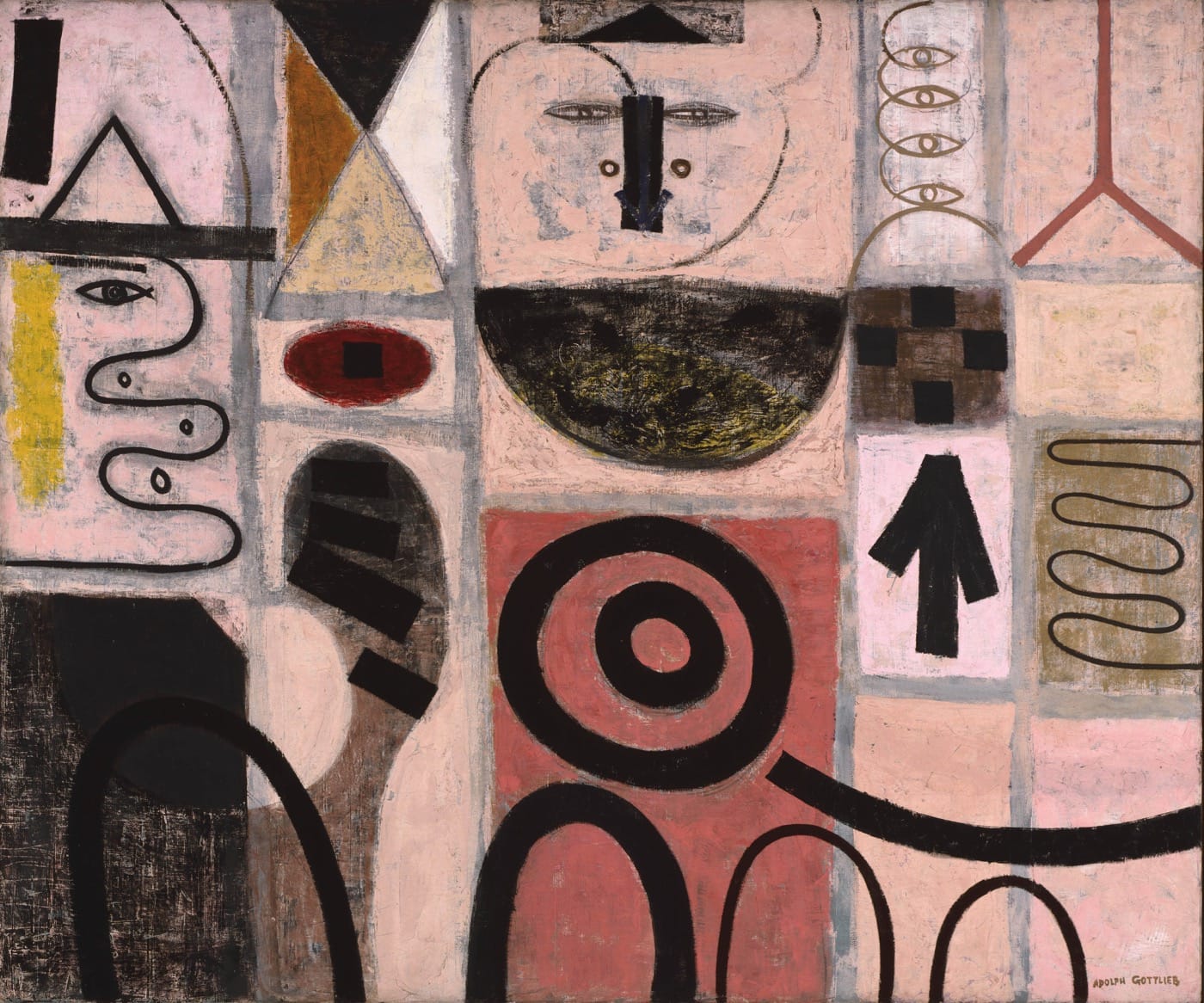 Highlighting four themes in Klee’s painting — nature, signs and symbols, pictorial writing, and polyphony — the exhibition connects individual Abstract Expressionists with different facets of Klee’s work. Mark Tobey, who shared Klee’s interest in calligraphy, is a clear successor to Klee’s pictography; whereas Motherwell’s doodling descends directly from Klee’s own childlike technique. Some artists’ works wear their influence more clearly than others: Adolph Gottlieb’s “The Seer” (1950), though of a larger scale, employs hieroglyphs that would be at home in one of Klee’s cabinet-sized works. In fact, this observation applies to many of the abstract expressionists: as Gene Davis said in 1983, “My last show of symbol paintings are just Klee blown up large.”