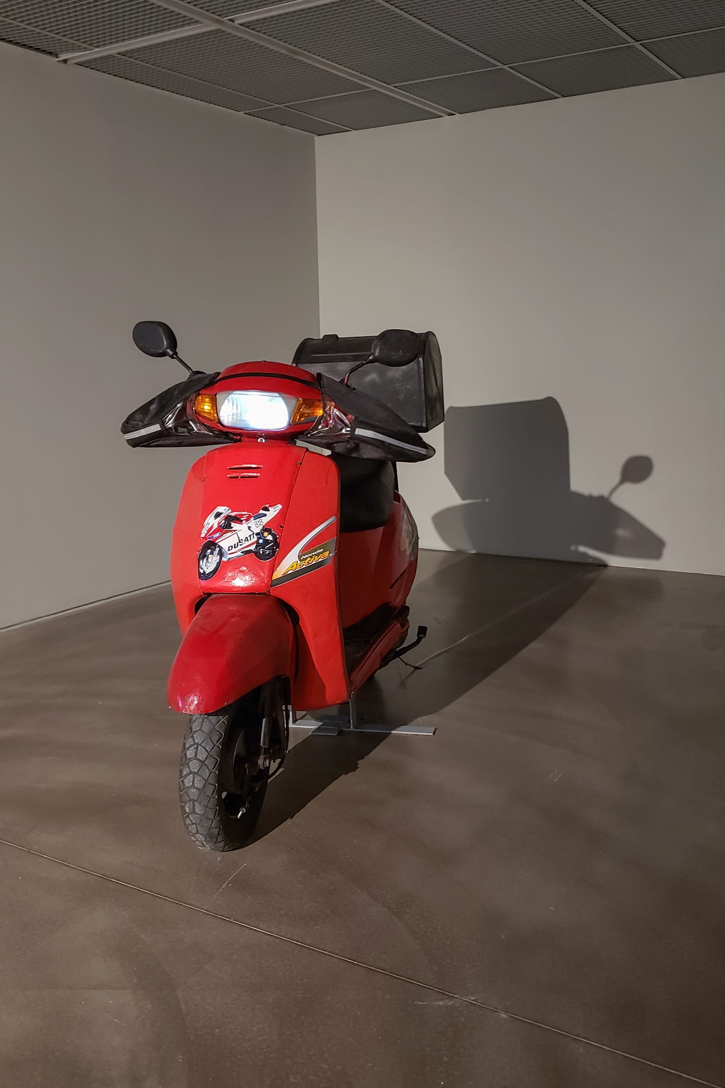 Upstairs, Burak Delier's fictional video, Courier (Kurye), follows a worker tasked with delivering the artist’s package to Istanbul Municipality. Before delivering the package, which contains audiovisual materials shot around Kanal Istanbul's route, the worker casually strolls around the city. Delier also presents a scooter that broadcasts electronic sounds and lights that interpret Istanbul's one-year seismographic data, as part of the installation. In this work, he invites audiences to collectively reflect on precarious employment, environmental justice, and impending earthquakes — all concerns of life in Istanbul.