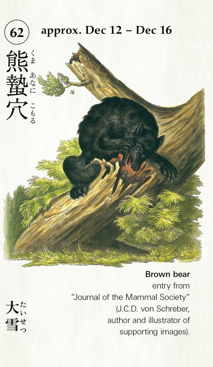 Last year, the Utsukushii Kurashikata Institute released a free mobile app for iOS and Android that pairs every day of this ancient system with beautiful illustrations and traditional Japanese texts. “72 Seasons – A year seen through the ancient Japanese calendar” is a no-frills, no-fuss program; it’s no productivity tool for you to record upcoming tasks or events. It simply presents a way to measure time without having to worry about precise dates — just observe the adjustments in temperature, wildlife, and the creatures around you. With 2017 on the horizon, now seems like a particularly fitting moment to look at the days to come through this fresh perspective.