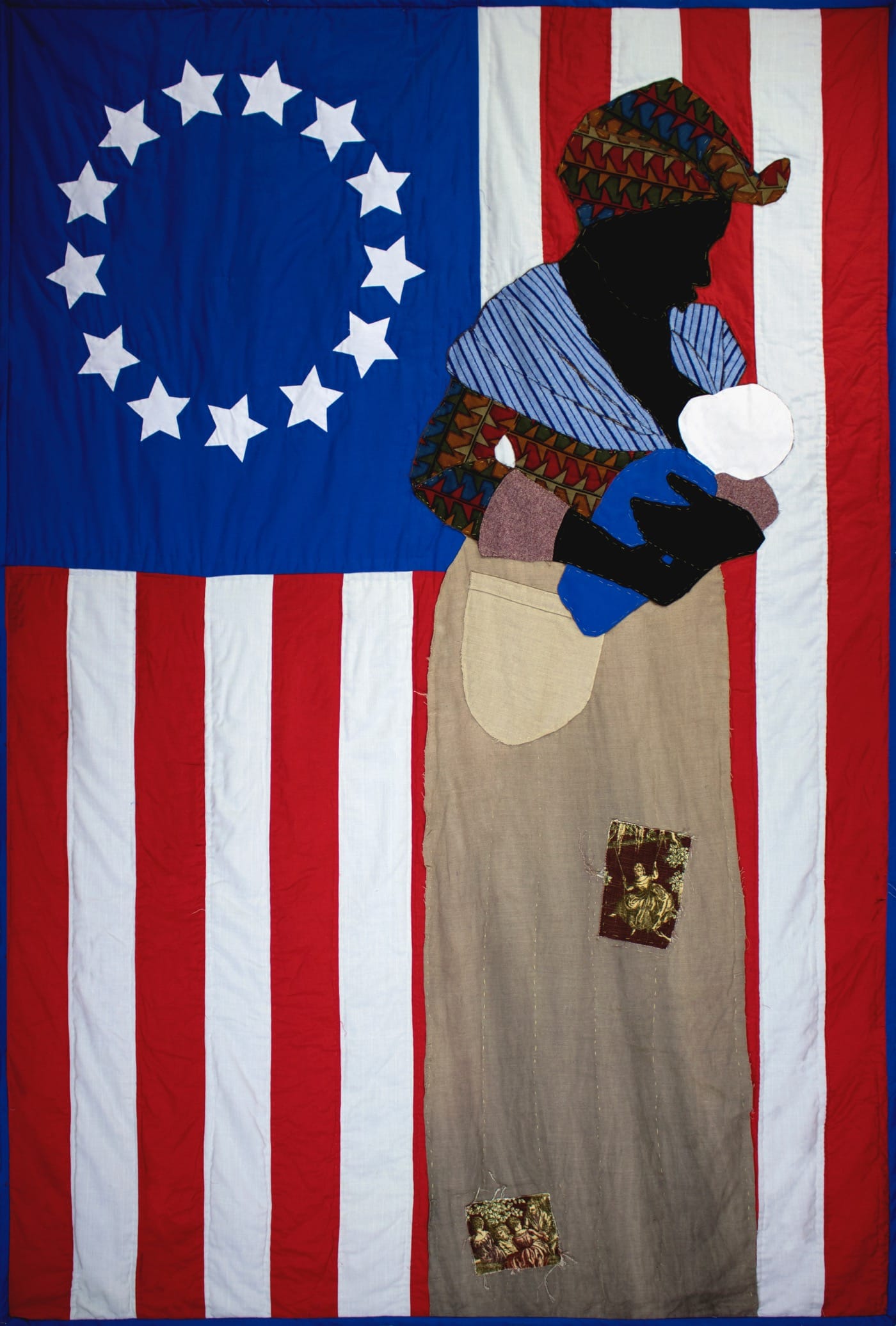 The flag’s bars appear clean while the woman’s skirt is stained with coffee and tea. She is faceless, her dipped jawline silhouetted only by the punctuated line of Towns’s hand stitch. More defined is the blissful face of the white woman in Jean-Honoré Fragonard’s “The Swing” (1767), which appears in printed fabric patched into the wet nurse’s clothes — a telling contrast between the uncelebrated labor of the marginalized and the leisure it makes possible for the rest. The narrow space between the flag and the dirt on the floor reads as an ironic nod to the sanctioned etiquette performed for the flag (it must never so much as graze the ground) even though many of the people it ostensibly represents rarely receive the same reverence.
