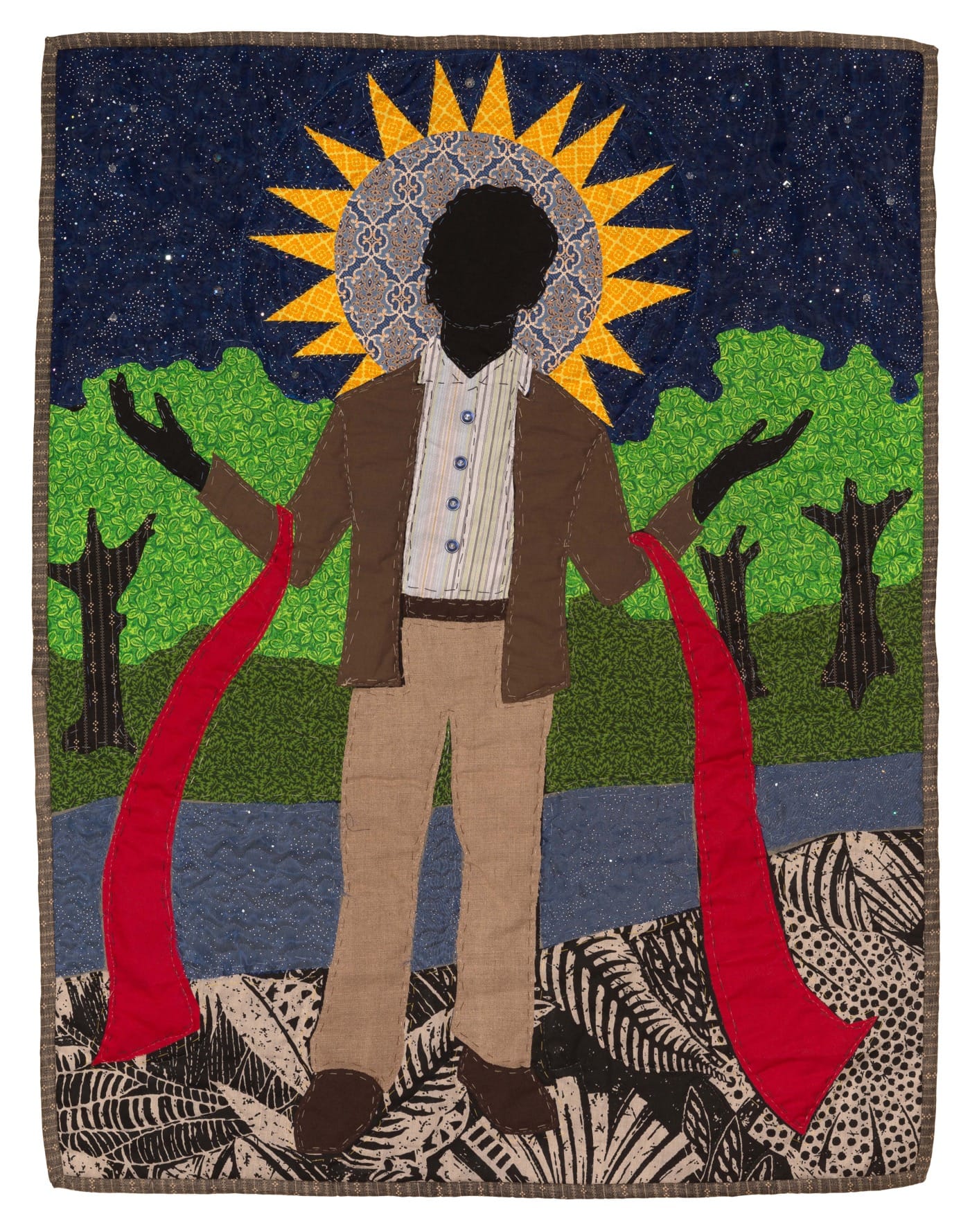 Towns culled many of the scraps he used in his quilts from his family’s home near Charleston, SC, where he was born in 1980, the youngest of 11 children, and grew up as a Jehovah’s Witness. He said that upon seeing his quilts, his mother and sister recognized some of the fabrics from dresses they’d made for themselves to wear to the Kingdom Hall.