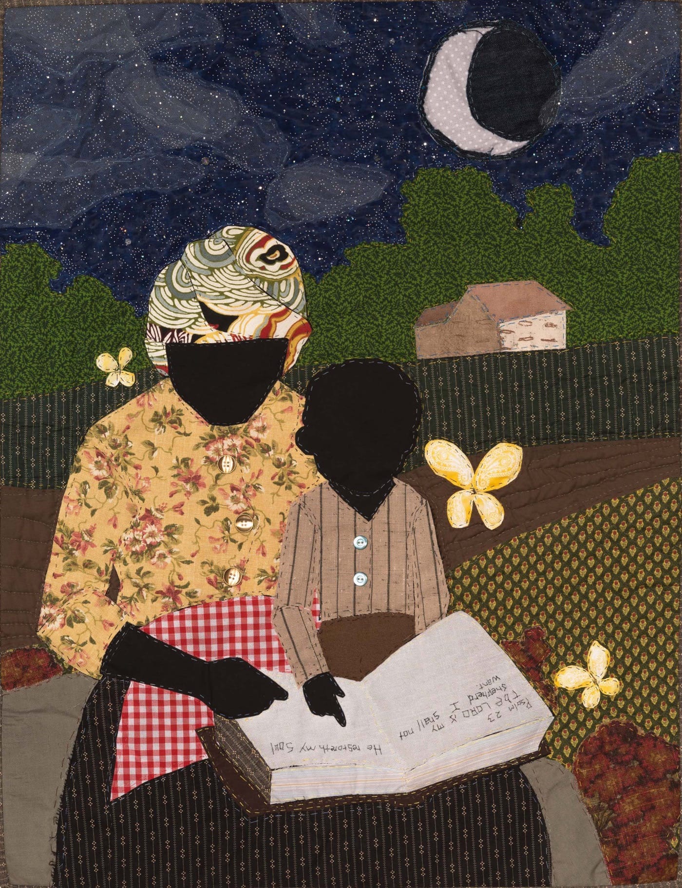 During the same visit to his show, Towns encountered a class from an East Baltimore elementary school on a field trip. He shook their hands and collected each student’s name before they returned to pointing out their favorite textiles used in “Special Child,” (2016) a piece acquired by the BMA for its collection from Towns’s Story Quilts series. The quilt depicts a young Nat Turner reading the Bible with his grandmother in a field. One student enjoyed the florals in the woman’s faded blouse; another liked the paisley-accented butterflies.