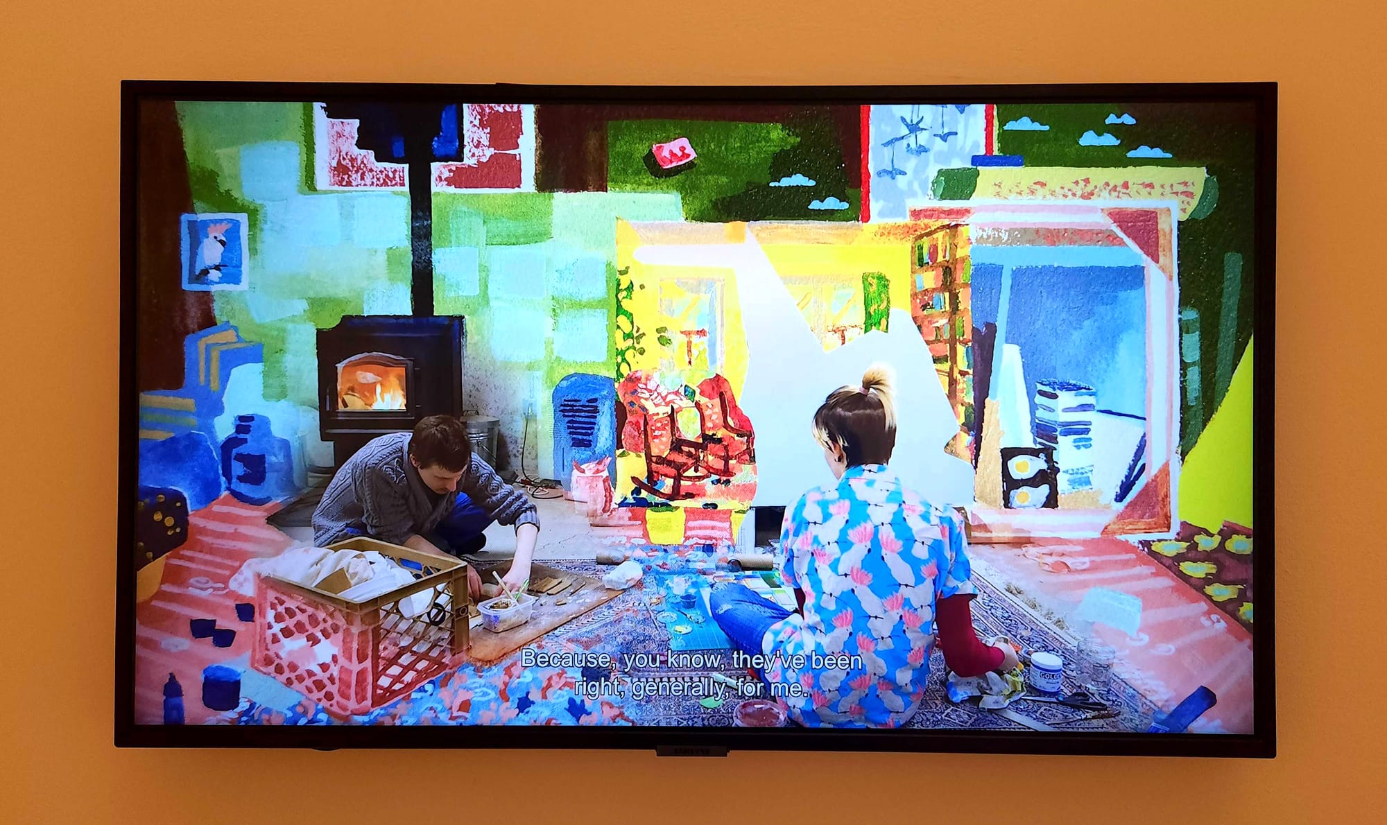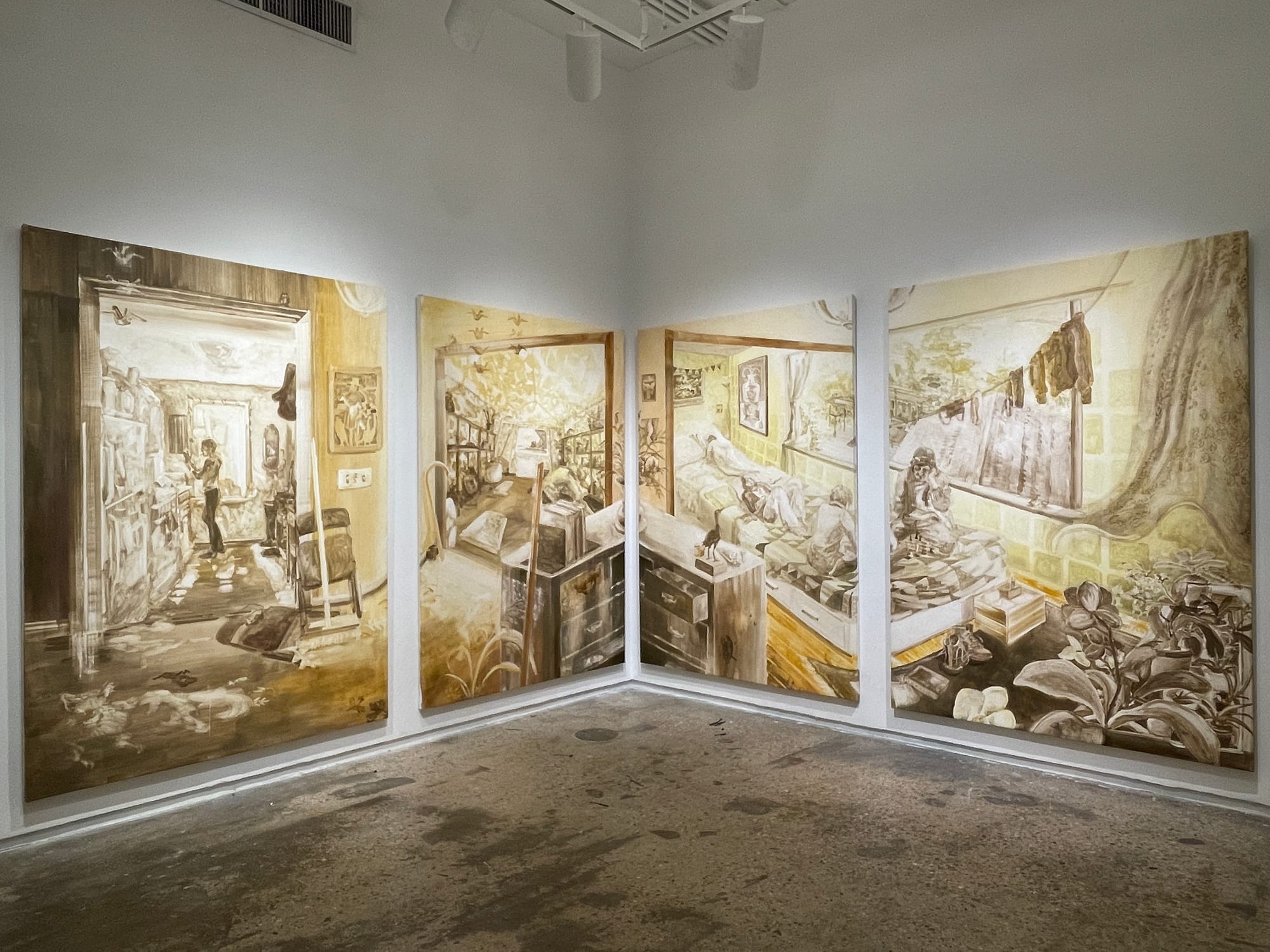Two artists whose works stood out to me the most were Lauryn Welch and Jordany Genao. Welch's section showcased six paintings and a live-action short film centered on her and her partner's relationship with regard to to her partner's life with Ehlers-Danlos Syndrome, a connective tissue abnormality that results in hypermobility, chronic pain, and frequent joint dislocation. Co-directed by Eloise Sherrid, Welch's film "The Body is a House of Familiar Rooms" (2021) incorporates her painting practice into the domestic environment through chroma-keying and omitting elements of the set background, designing a playful, comforting new world within the home that doesn't seem as small for those who might be confined in it. Welch's film is complemented by a series of four large continuous paintings on wet-sanded primed canvas, evoking the texture of Yupo paper in its slick impermeability. Through a muted, neutral palette swiped and bristled decisively across the surfaces, Welch renders a conglomeration of homes she and her partner have occupied over the decade and emphasizes the way these spaces are used and restructured to best serve them.