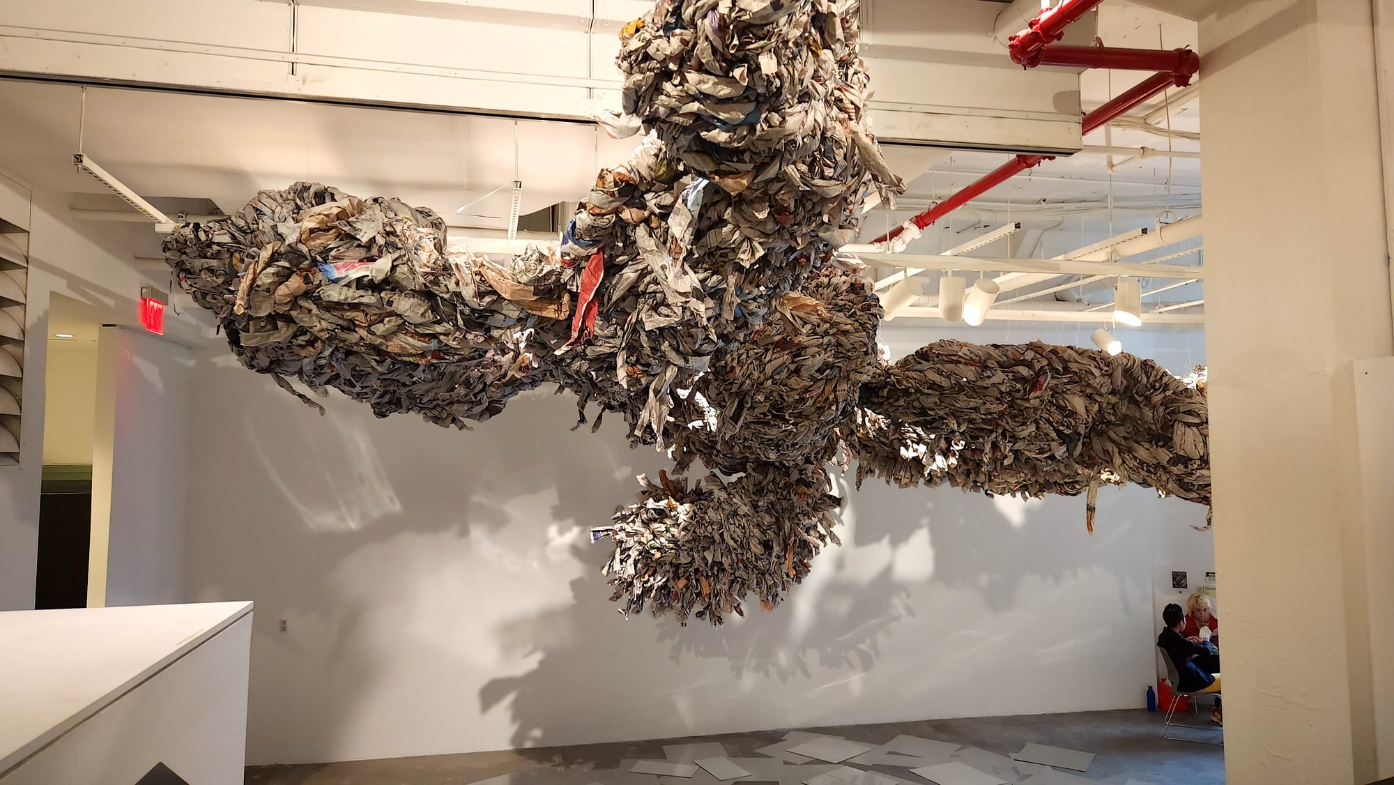 Stepping through the gallery's vestibule, I stood beneath a looming, floor-to-ceiling installation by Eiko Nishida. Comprised of hundreds of newspapers in different languages and blank sheets of newsprint paper fastened around a chickenwire armature, "The Worlds We Live In" (2023) illustrates Nishida's interest in how information is conveyed worldwide. An editorial graphic designer by day in Japan, Nishida is captivated by the manner in which the same event and its surrounding facts can be altered or shaped by the language in which it's told. Taking into account differing grammatical structures, tones, and other components that contribute to varying accounts and receptions of current events, the artist pays mind to print periodicals as an increasingly obsolete form of media, as well as the ways in which we selectively cast aside bits of information. Nishida applied mylar decals cut to the same size as newspaper spreads and folded sheets on the floor beneath her suspended installation in an allusion to the unceremonious physical and mental disposal of current events.