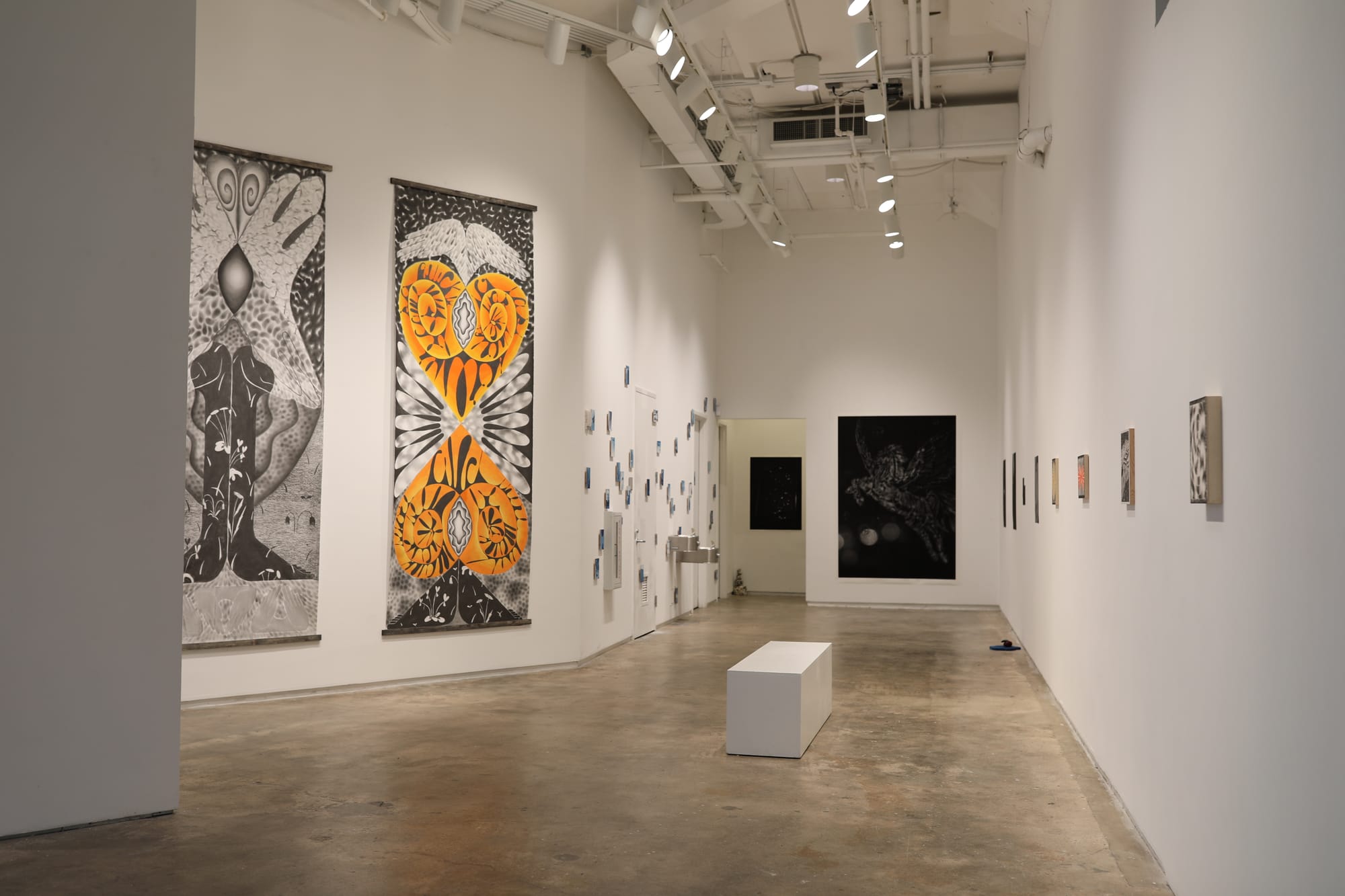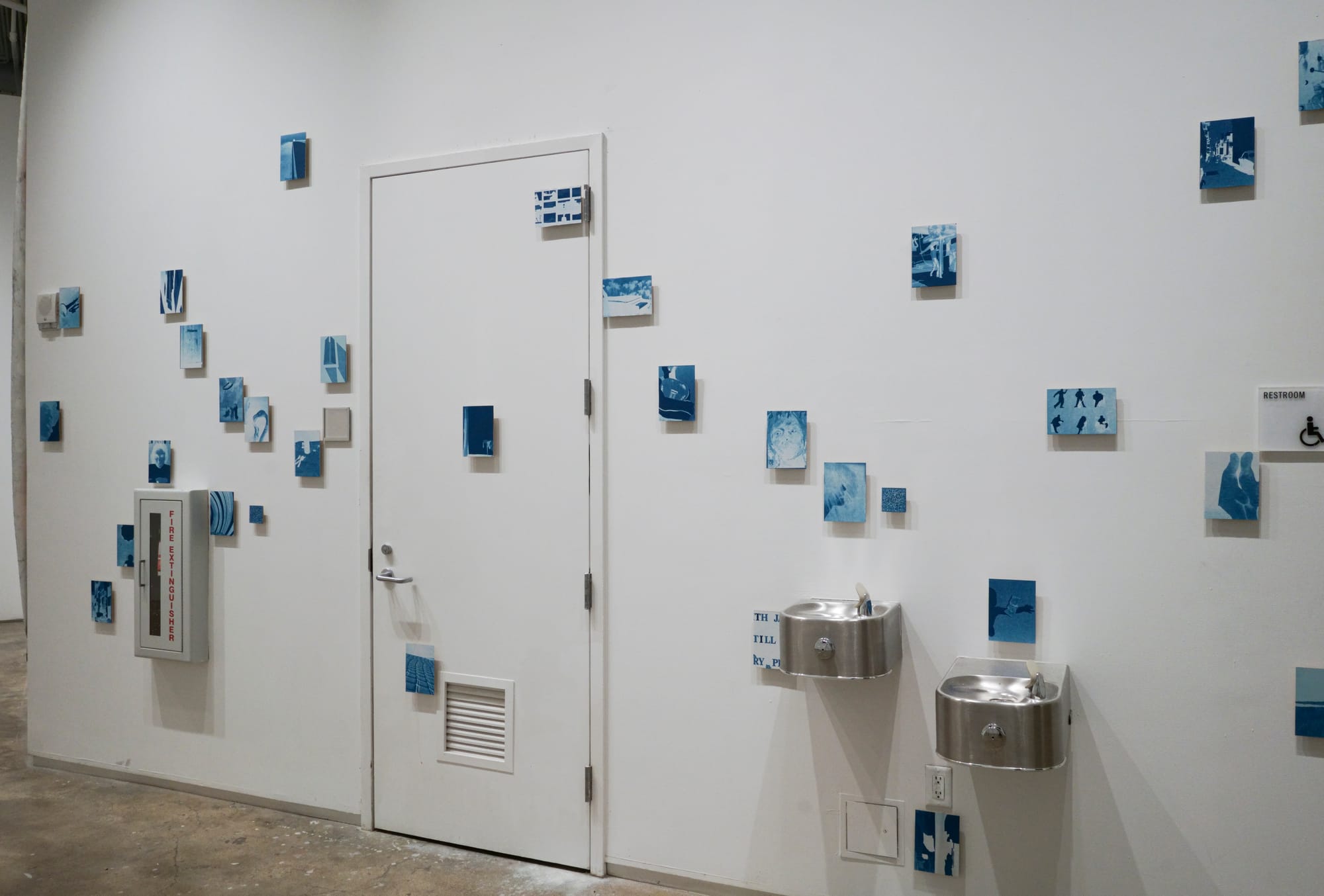 On the left-hand side of the gallery, Corinne Bernard's graphite panel and paper works radiate alongside jiwoong's (the student preferred to identify by first name only) mixed-media print installation that delves into memory and family dynamics. Bernard's mastery of graphite, most welcome during what I consider an unofficial graphite revival period in visual arts, is propped up by her efforts to decipher the starting point of the universe through an appreciation for symmetry and elements of sacred geometry in both natural and imagined occurrences. The playful energy emanating from jiwoong's high-contrast cyanotype prints that stud the walls and doors of the gallery bounce off of Bernard's drawings before getting sucked into the vortex of his tense and mature black-and-white wall-adhering photography.