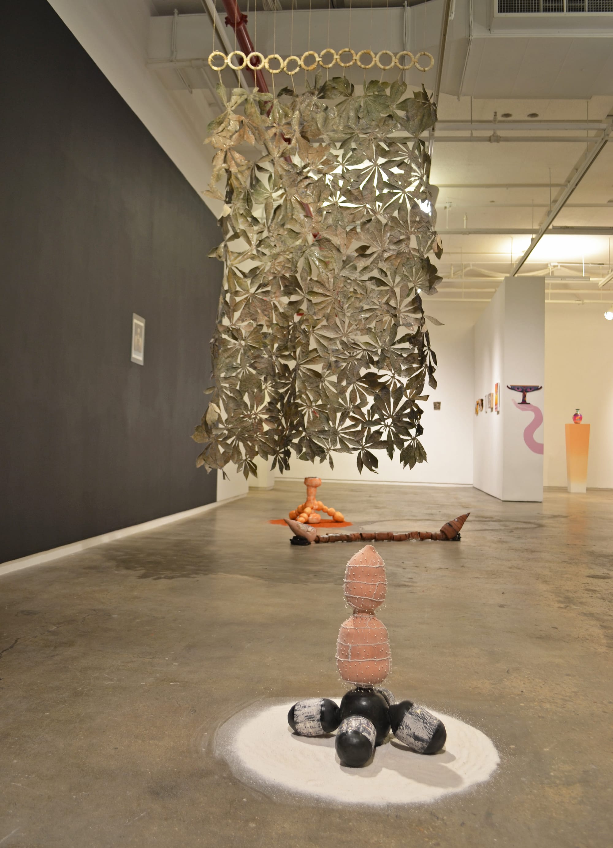 Jordany Genao's three-dimensional practice is rich with references to their Arawak-Taíno ancestry. Hailing from the Dominican Republic with a background in botanical studies, Genao incorporates culturally relevant organic materials in their sculptures and installations and deliberately employs these materials in their various forms. Some of these materials include cassava leaves and flour; banana peels, flowers, and silk fiber; corn husks; and bija powder. Genao cleverly emphasizes queerness and politely topples the colonial hegemonies that have erased and suppressed Indigeneity by honoring these byproducts with beauty and care. "The banana flower is very symbolic of a Caribbean space," Genao told me, "but also a very sexual space, and I wanted to incorporate more homoerotic imagery in my work." Genao's works are gentle, but deeply engaging in their material histories and subversive approach to re-Indigenizing one's cultural immersion.