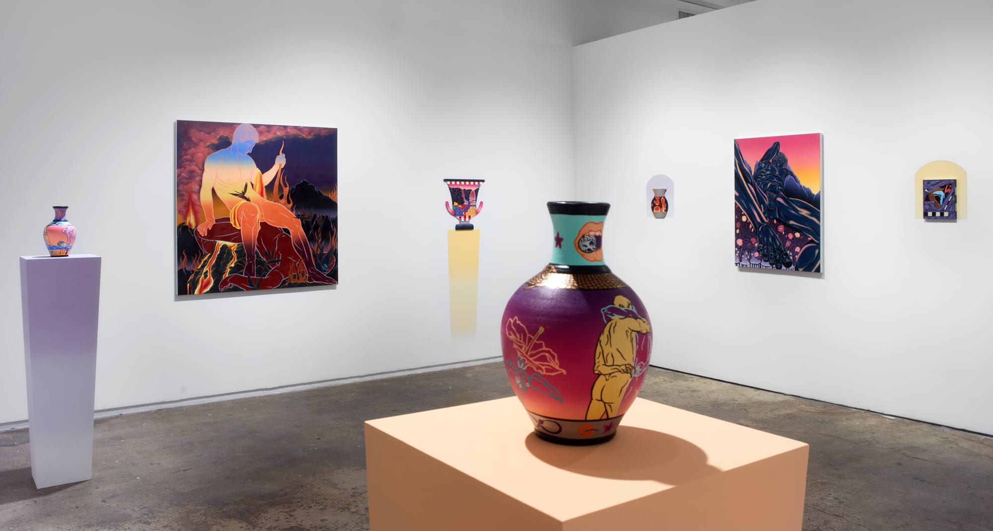 Paul Anagnostopoulos's vivid work offers a new take on ancient Greek aesthetics through a contemporary queer filter. The artist's graphic approach to his paintings and decorative pottery is surprisingly influenced by old-school video games and their use of gradient backgrounds to indicate depth in an environment. Anagnostopoulos's foray into dimensional storytelling honors the ancient Greek histories and mythologies that were rendered on pots and vases in the interest of "thinking in the round" rather than within a singular snapshot frame. Adjacent to Anagnostopoulos was Ashlyn Diaz's monumental ode to the Florida coast by means of reclamation and care. Diaz extracts both materials and histories from her evolving practice by repurposing old artwork and other collected objects for her newfound papermaking craft rooted in diasporic healing.