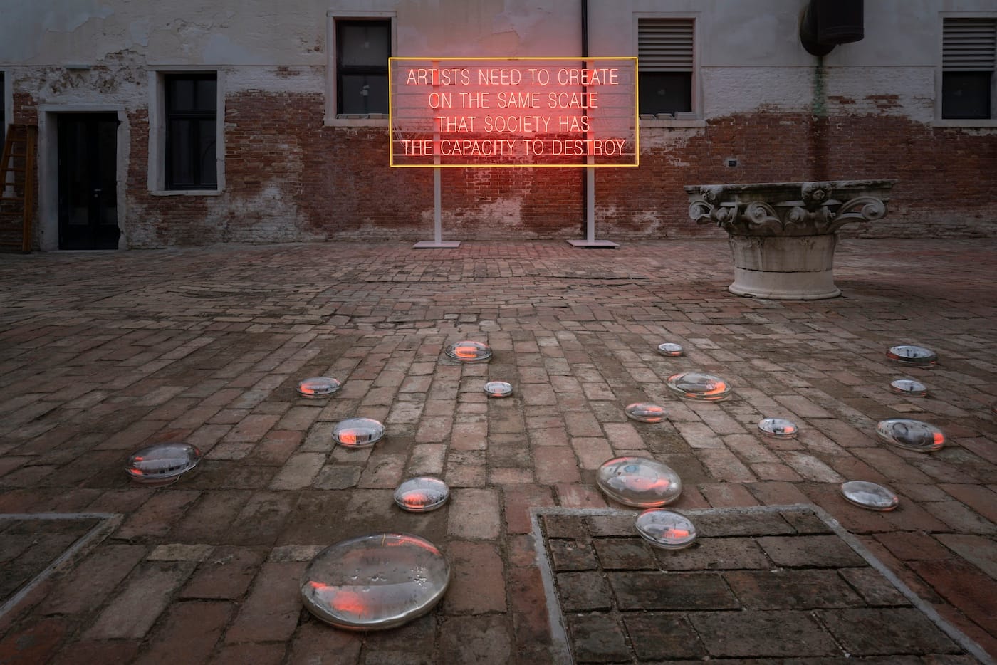 Finally, in the courtyard, which you enter from the street to the right of the church, are Maya Lin’s site-specific installation, “Water Water Everywhere, Not a Drop to Drink” (2019) and a stage for cooking performances by Rirkrit Tiravanija, Tomas Vu and Sarah Sze. There is also a large neon sign by Lauren Bon and The Metabolic Studio, which provides the exhibition’s title, “Artists Need to Create on the Same Scale that Society Has the Capacity to Destroy.”