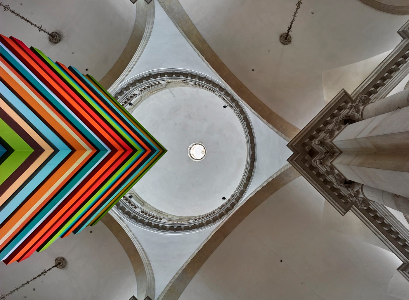 Entering the whitewashed stucco interior, Scully’s “Opulent Ascension” (2019), a ten-meter-tall sculpture constructed of narrow, vividly colored horizontal bands, rises under the great dome over the crossing, midway between the entrance and the high altar, lit from above. Then, exiting on the left, you walk down a narrow corridor, with the painting “Landline Gold” (2019), also consisting of horizontal bands, on the right, and enter the sacristy. This space, where sacred services are prepared, is devoted to drawings that reveal “just how much mediation, ingenuity, and passion goes into creating the larger-scale paintings and sculptures” (according to the exhibition notice).