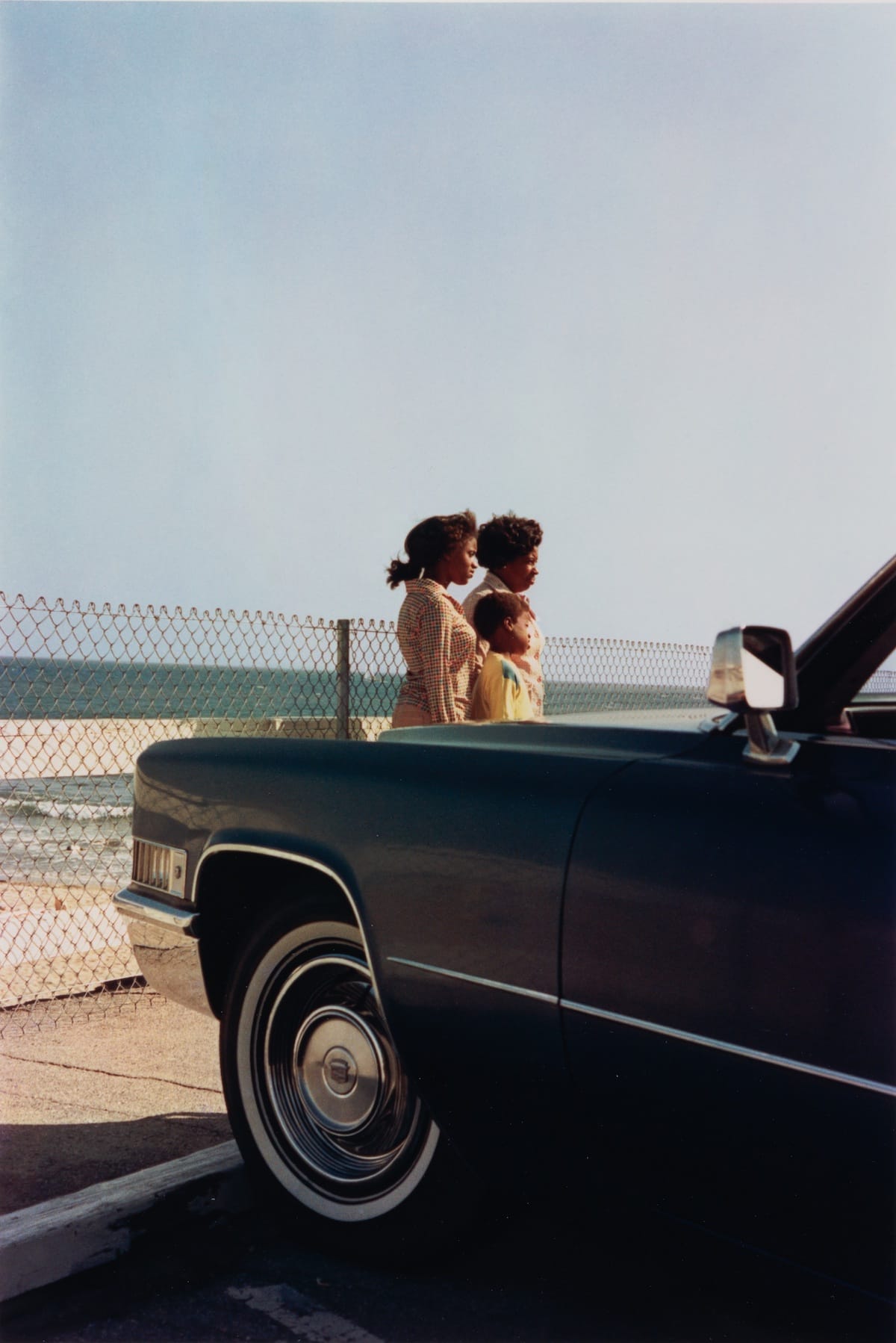 Eggleston is rightly hailed as a genius of color photography and pondering the beauty of his images can overwhelm any other interpretation. For example, “En Route to New Orleans” (c. 1971–74) shows a hand stirring a drink resting on a plane’s tray table. Out of the window small white clouds float in a blue sky, and light streams through the glass, creating a shadow refracted in yellow and red. This burnt-hued reflection, filled with sparkle and depth, is exquisite. The image might touch on themes of American luxury (is it Coke in the glass?), the allure of alcohol (whiskey?), or the meaning of a hand’s disembodiment, but all interpretations deflate when confronted with the perfection of the photograph’s aesthetics. The same could be said about “New Mexico” (c. 1971–74), which shows a big western sky, fluffy white clouds set against gorgeous blues.