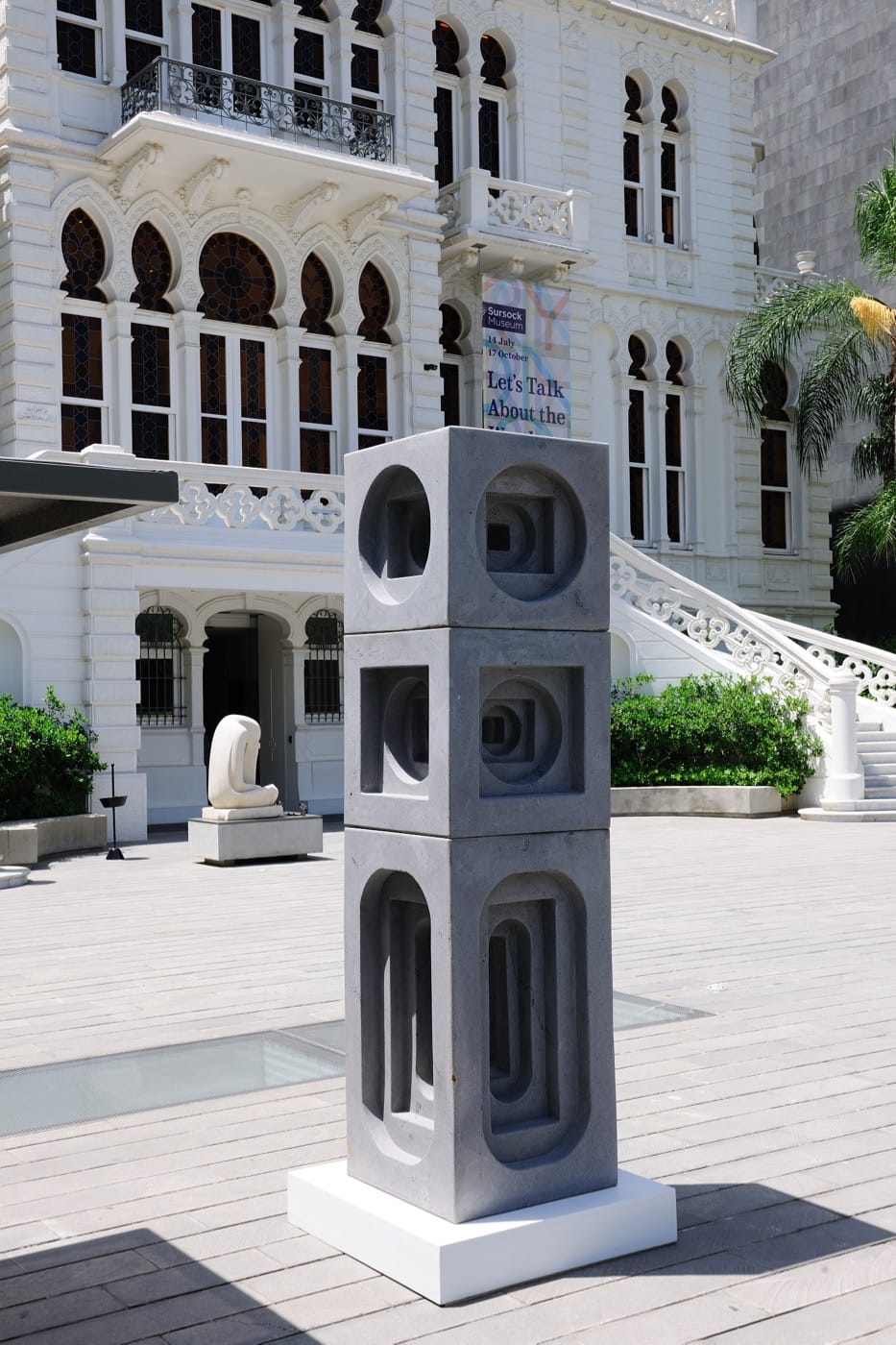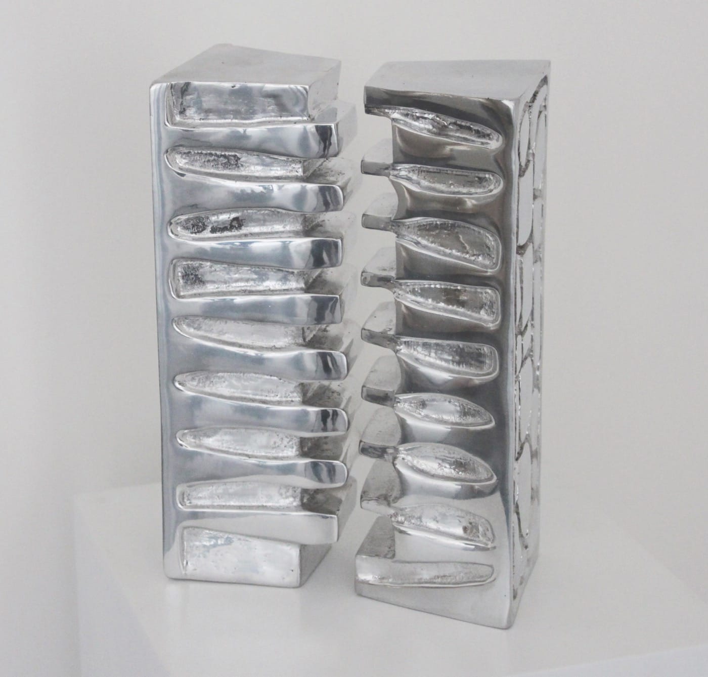 In 2015, while working at a Lebanese gallery, I was part of the team that conceived a presentation of one piece from Choucair’s Dual series alongside two contemporary Lebanese artists (Saba Innab and Tanbak), for a curated section of art from the Middle East at the Armory Show. I now realize the extent to which I fell prey to hearsay, explaining away her work in the text I had written for our presentation, as an articulation of “her experience of a Beirut divided between East and West” (the fault line during the civil war). I also reproduced the claim that the artist had been inspired by architectural brutalism in general and Le Corbusier’s Unité d’habitation in Marseille in particular, and applied these influences to depict Beirut in blocks that can be assembled and reassembled. Now there is a story in almost every review written of Choucair’s sculptures that highlights the influence of brutalism and Le Corbusier in her work. The influence might indeed be there, but this repeated story overshadows the artist’s own formal research which deserves a more searching analysis.