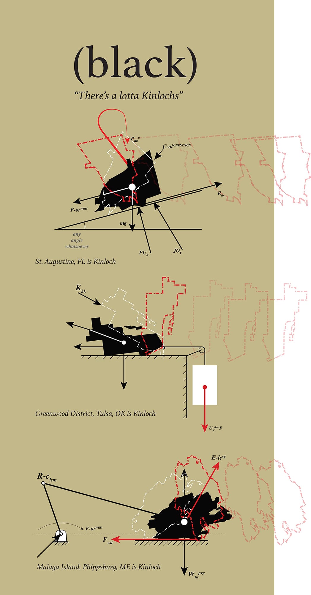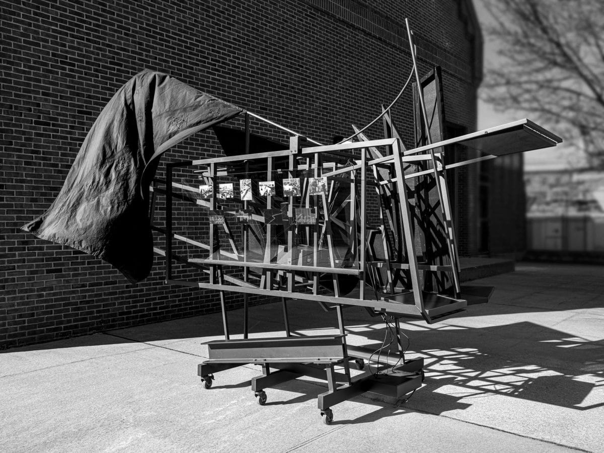 The other entrance to the exhibition — from a set of elevators — features a map that marks the cities represented in the exhibition, along with historic Free Black towns across the United States. At this entrance, the visitor is located not in MoMA, but in the layered, concealed spatial politics of the United States. Beginning with a map introduces Reconstructions as a challenge to accepted cartographies of the United States, and suggests to visitors that they will be able to use the map as a reference and navigational tool as they move through the exhibition. Walking into and through the galleries, however, reveals that how the speculative projects might exist in real space remains quite unsettled.