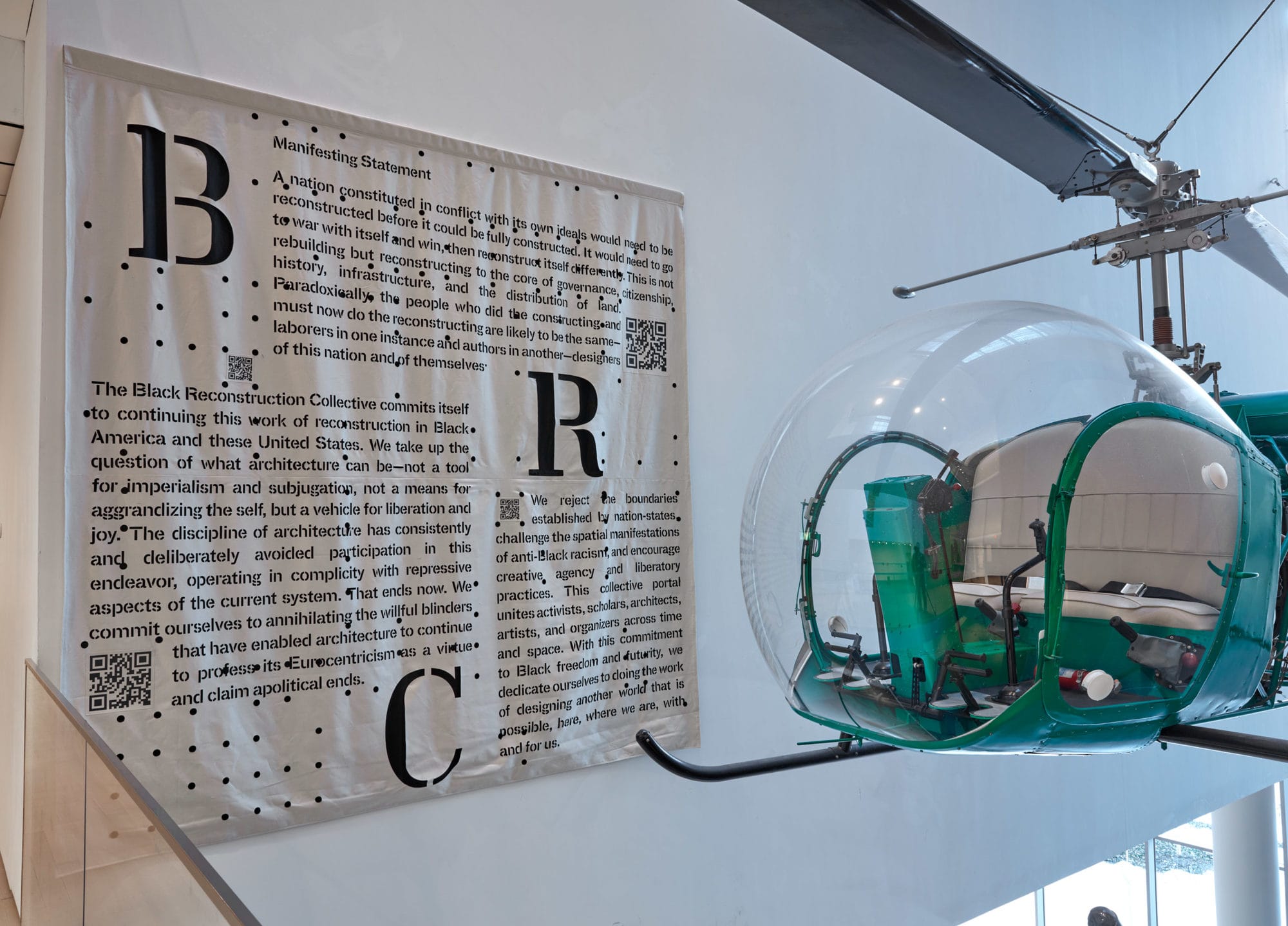 Spread across two galleries, Reconstructions offers visitors two different models for approaching the exhibition. At the South entrance, visitors are confronted with the Black Reconstruction Collective’s massive “Manifesting Textile” (2020). The work spells out the ethos and urgency of a radical reconstruction project and intentionally obscures the plaque bearing the architect Phillip Johnson’s name. Paradoxically, the shrouding brings Johnson’s known but institutionally unacknowledged white supremacist beliefs to light for MoMA’s visitors. By employing the modernist medium of the manifesto, the collective connects their intervention to the narrow art historical lineage upheld by MoMA’s collection, all while exposing the institution’s less palatable legacy.