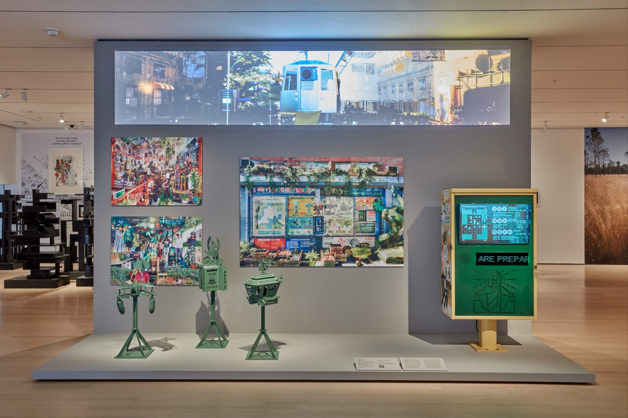 Another alternative future is being pushed for outside of MoMA’s galleries by the StrikeMoMA Working Group, whose rallying cry imagines a “post-MoMA” future, a tenet that calls for the disassembly of the museum, property and wealth redistribution, and Indigenous land repatriation, among other demands. In its own way, StrikeMoMA also engages with questions of spatial politics and reconstruction. In both the strike outside MoMA and the projects in the galleries, the capacity for imagining new futures is limitless, with more to be gained from dreaming than pragmatic, incremental change. Though Oakland’s San Pablo Avenue may not be transformed into a Black, liberatory, mixed-use built environment — as imagined by Walter J. Hood — any time soon, just as MoMA is unlikely to ever dismantle itself, the immediacy of both the strike and Reconstructions present these possible futures not as provisional but rather as vital concerns worth pondering.