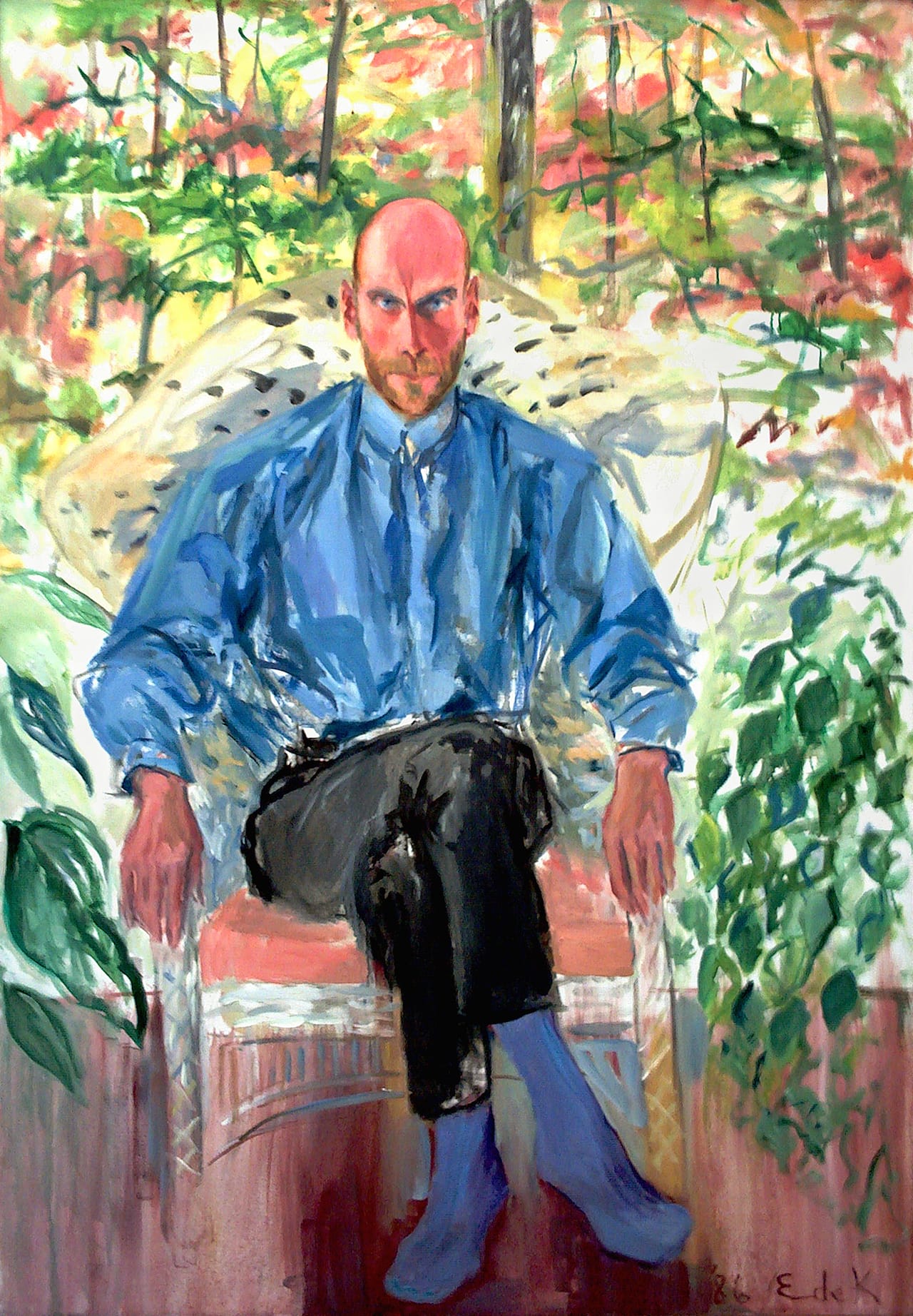 Painted three years before her own death from lung cancer, Elaine de Kooning’s portrait retrospectively reads almost like a coded self-portrait, as her close friend Marberger was himself fighting a losing battle with AIDS. Marberger’s thin, rosy, oval face, with its blue eyes and crystalline gaze, combined with his blue-sleeved elbows resting on the arms of a large wicker chair, lend him an air of imperial defiance. The autumnal leaves of the East Hampton woods loom everywhere above and behind him, while dark green plants inside the studio intrude on his left and right. Landscape painting seems to be suddenly invading the realm of portraiture, mitigating the solitude of its human subject and, in doing so, preserving forever its life-giving sunlight.
