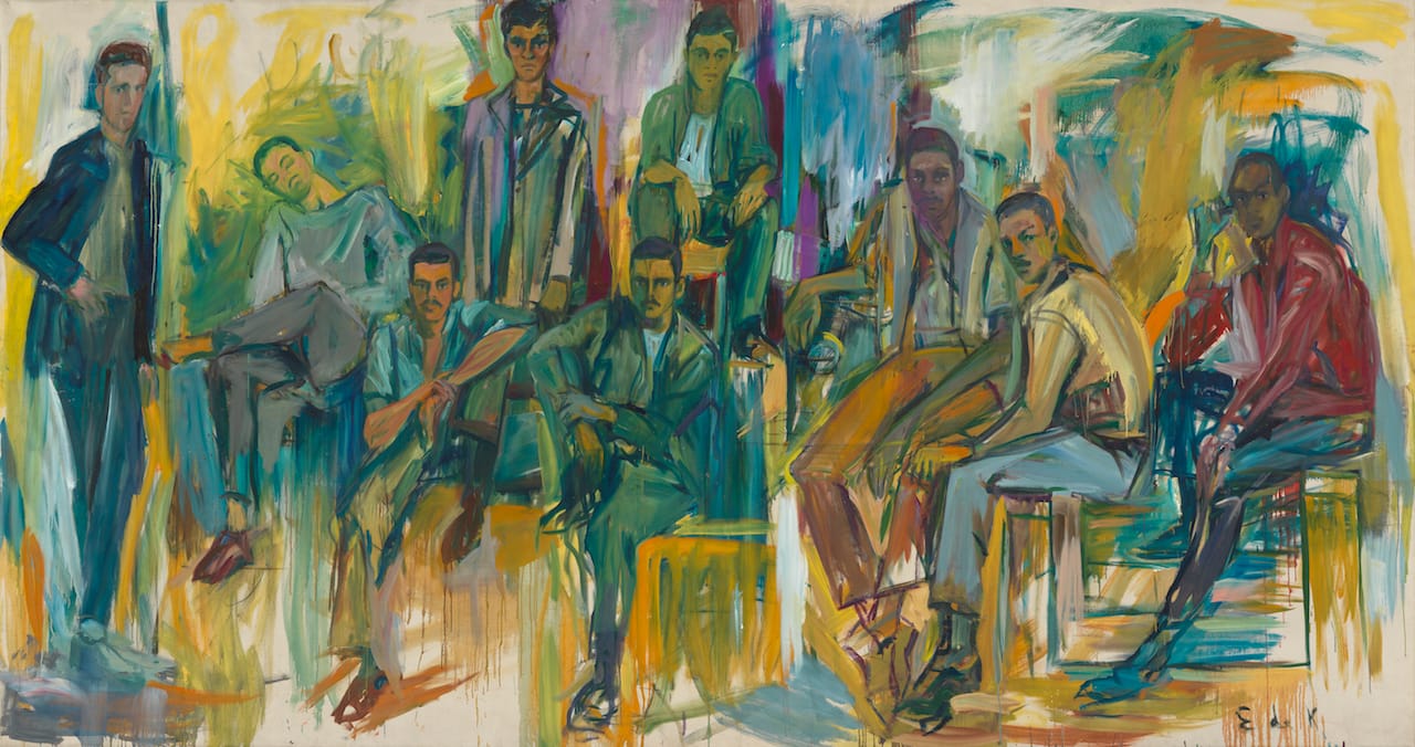 This confident equilibrium between experimentation and realism animates the anonymous figures that populate “The Burgers of Amsterdam Avenue” (1963). Measuring roughly seven feet high by fourteen feet wide, the painting can be seen as a proto-feminist, figurative painter’s answer to such abstruse AbEx monoliths as Jackson Pollock’s “One: Number 31” (1950), Clyfford Still’s “1957-D, No. 1” (1957) and Robert Motherwell’s “Elegy to the Spanish Republic” (1961). The portrait, which depicts nine young men, most of them African-American or Latino, who are housed in a special public school for narcotics offenders, proves that imaginative abstraction coupled with a brassy, Pop Art-like surface can deliver just as much political heft as the often heavy-handed symbolism and dour imagery of American social realism. It is a clever provocation to the cosmopolitan art-consuming public – marrying Richard Brooks’ 1955 film version of Blackboard Jungle to Auguste Rodin’s “The Burghers of Calais” (1889).