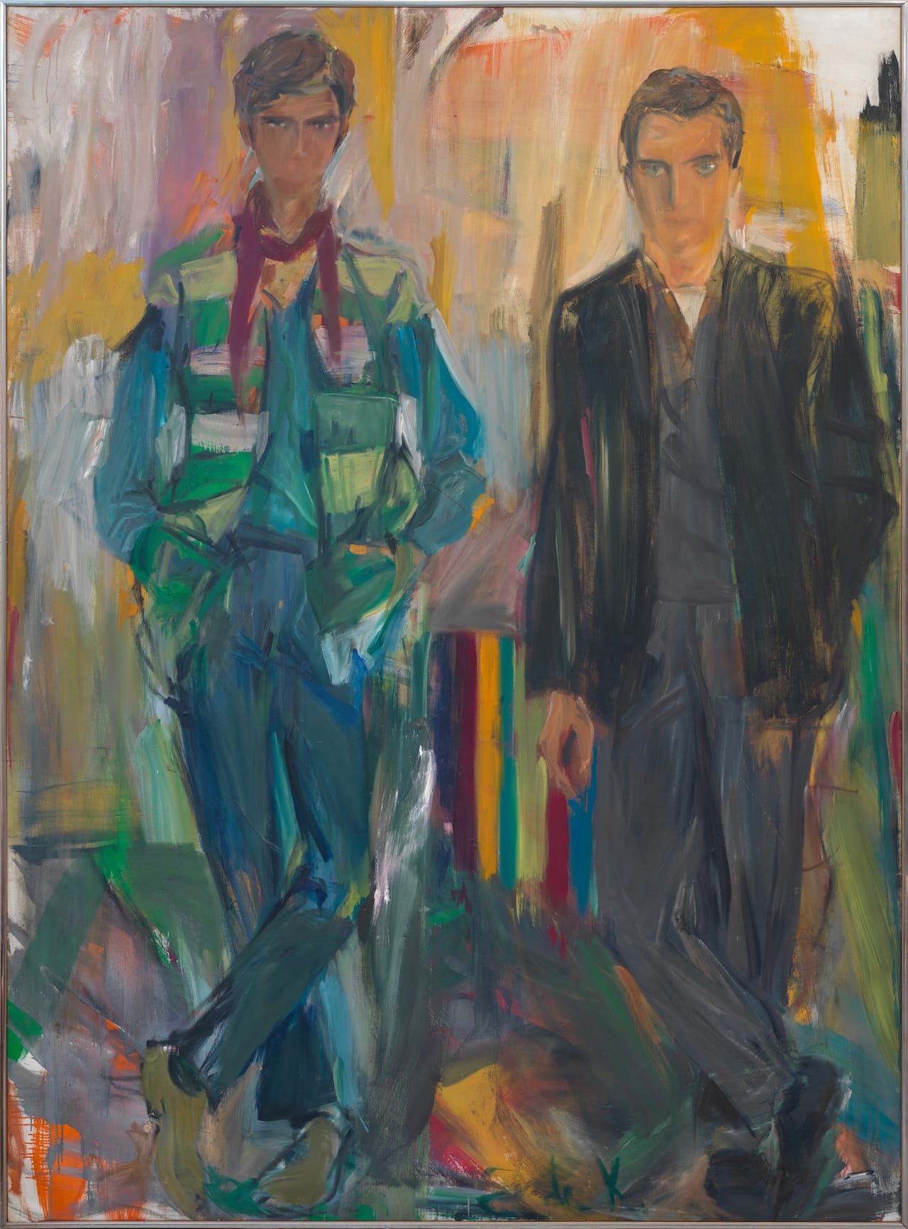 “The Loft Dwellers” (1961) is arguably the best example from this new phase in her career. A life-sized double portrait featuring two tall artists named Eddie Johnson and Robert Corless, who were protégés of Elaine’s, caught the discerning eye of Fairfield Porter, who raved about it in The Nation, declaring, “it is the first time I have seen [Elaine de Kooning] handle in a portrait her abstract color so that is [sic] integrates with the drawing and the likeness.”