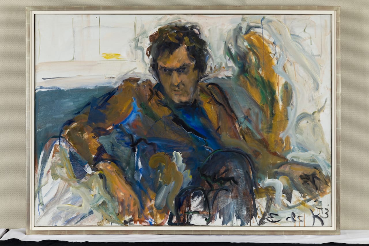 The highlights from this period include a rare 1973 portrait of Robert De Niro, Sr., her famously reclusive contemporary from the New York School. De Niro sits on a blue-gray couch, his left arm leaning into its cushions. He sits askew, with a furrowed brow, staring downwards as if to look beyond the present moment, which Elaine de Kooning is trying to preserve on his behalf.