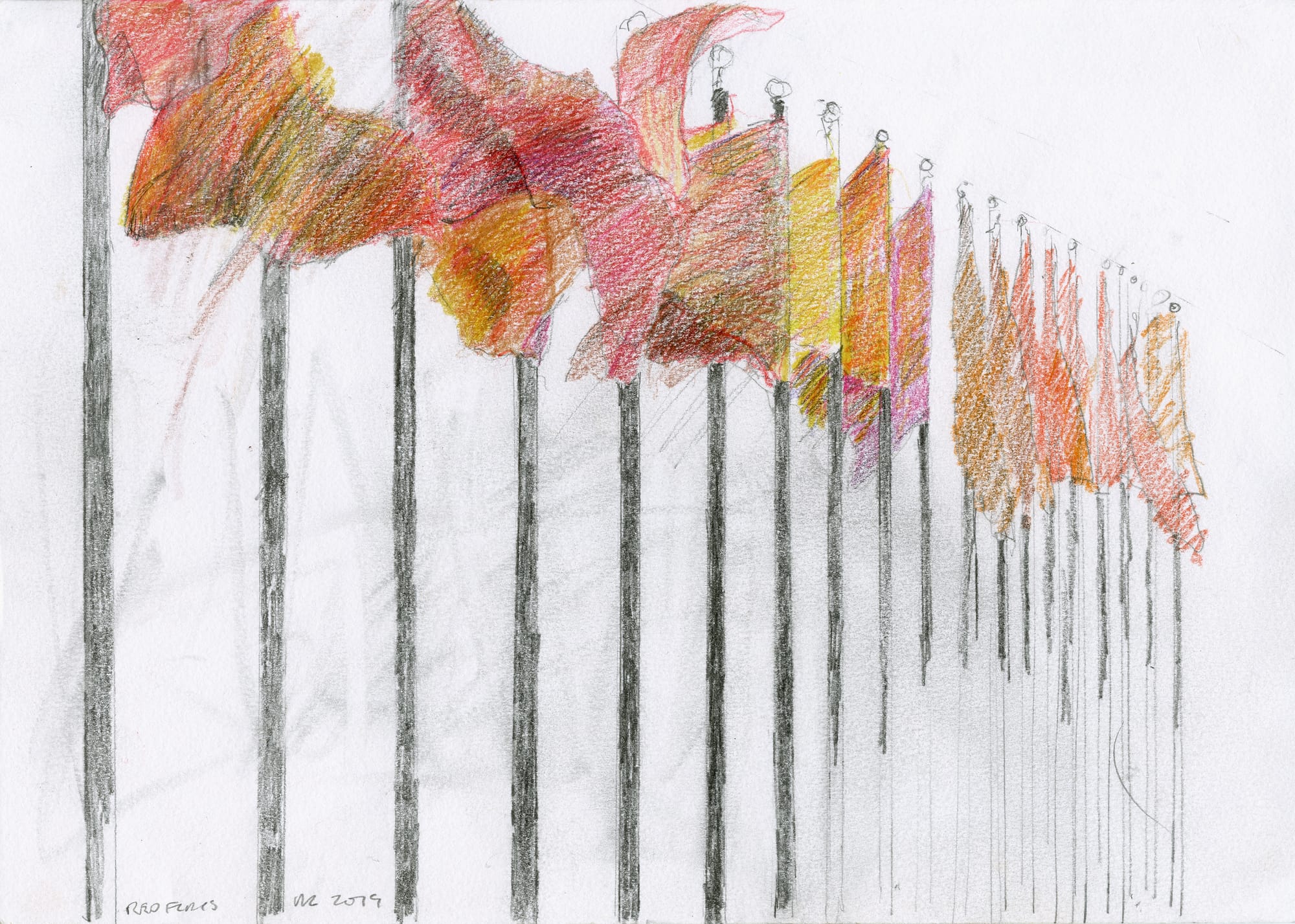 Though the flags’ dusty hues and lack of iconography create a tranquil, down-to-earth mood, Red Flags also conveys a sense of alarm. The color orange, used for traffic cones and biohazard signs, can come across as cautionary. The idiomatic meaning of the term “red flag” — a warning or danger sign — is even more portentous. And the flags themselves waver between evoking optimism and pessimism. When the wind blows through them, they recall the fluttering orange pageantry of Christo’s and Jeanne-Claude’s crowd-pleasing 2005 Central Park installation The Gates; however, when the air calms, Goldsworthy’s flags droop and sag in a way that’s at odds with the vibrancy of the color scheme. The jaunty pop standards piped into the plaza’s speakers — Bill Withers’s “Lovely Day”; The Talking Heads’s “This Must Be The Place” — feel discordantly upbeat during the flags’ more languid moments.