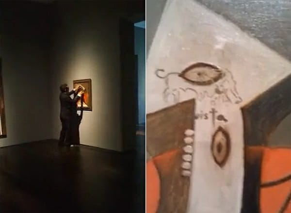In yet another venerable tradition, art vandals begin with an act imagined to enhance the meaning or value of a canonical art masterpiece, and end up with entree into the art practice and business of the day. Tony Shafrazi, who gained notoriety by spray painting “Kill Lies All” on Picasso’s “Guernica” at MoMA in 1985, was attempting to amplify the painting’s ever-urgent appeal for peace, an appeal he felt was silenced by the context in which it hung — a super-civilized high-art institution in which patrons milled about and opined in hushed tones. He wanted to “retrieve it from art history and give it life … get involved with the making of the work.” Shafrazi is now a blue-chip art dealer.