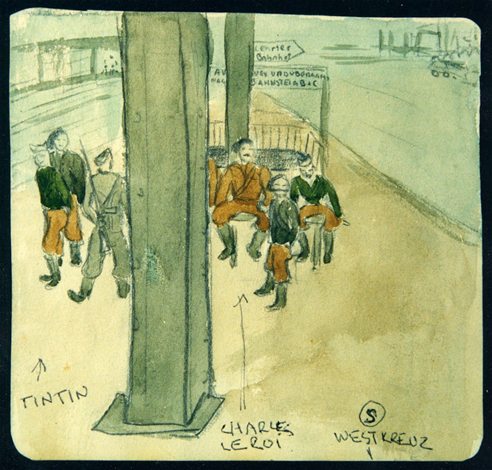 The Frenchmen, who were being worked to death, warned the girls to burn the notes they wrote in return. “Like us,” one prisoner told Mietje, “the letters end up in the fire.” But when Mietje fell ill with pleurisy and went to her family’s village to recover, she brought the letters and her drawings documenting the exchanges, rolled them up in a bottle, and buried it in their garden. Copies of some of these buried sketches are on display at the exhibition. Mietje was still in the countryside when the authorities began their investigation, trailing members named in the intercepted radio message to find their associates. Thus, she survived. After the war, she became a painter.