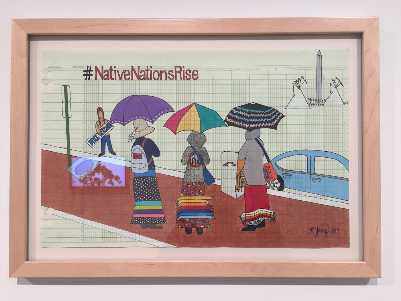 Holly Young’s “Native Nations Rising” (2017), meanwhile, nods to historical uses of ledger paper to create Native American art. Young depicts three figures wearing long skirts and holding umbrellas, each with some element in their outfits that shows off their Native identity. The figures face away from the viewer, looking toward a Native American protester across the street and, farther off, a national monument occupied by tipis. Like Myles’s work, this piece feels like a document of a moment, though Young’s is less specifically placed on a single issue.