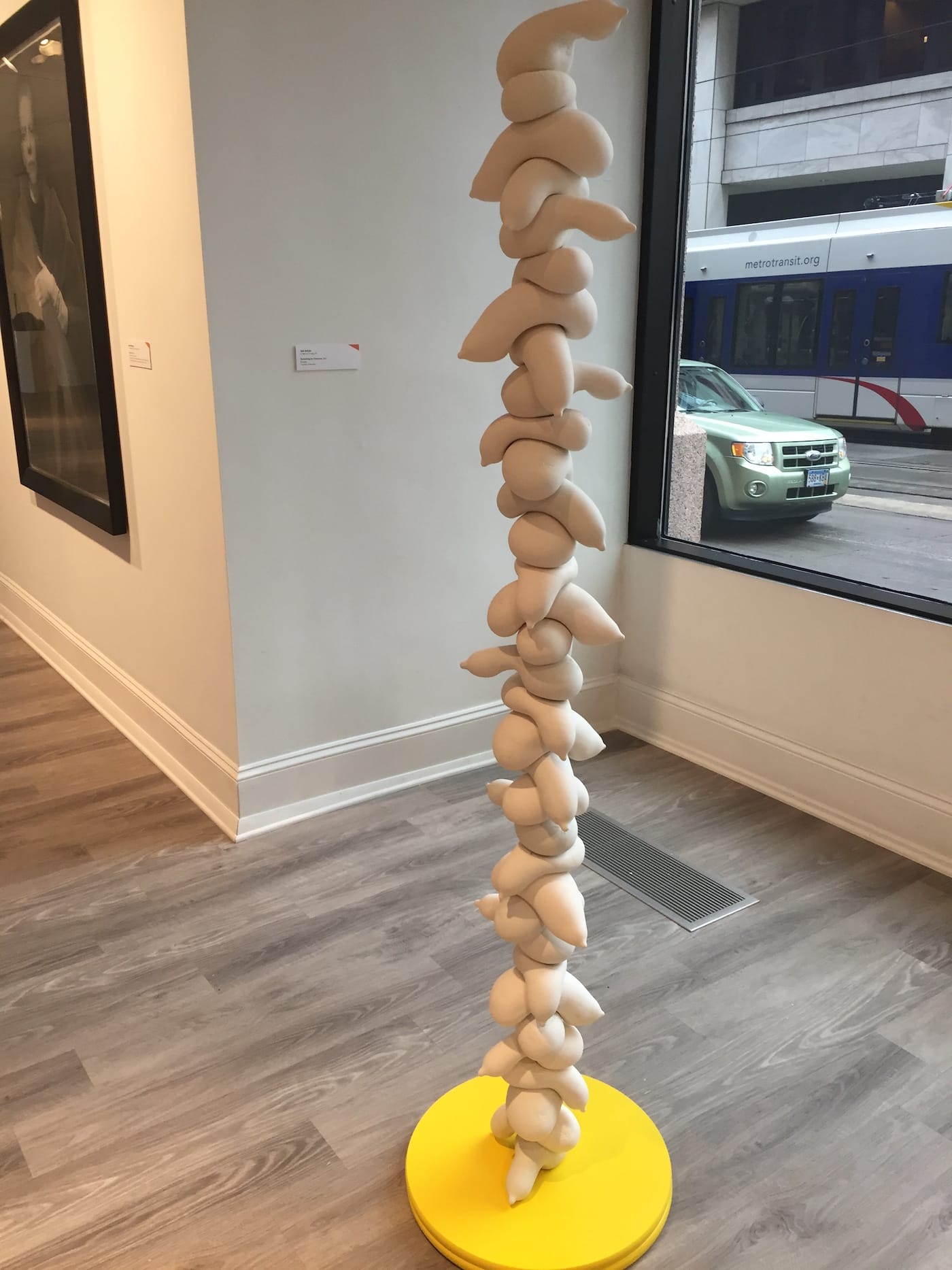 Similarly, “Something for Everyone” (2017), Josh Schutz’s erotic tower of porcelain sacs (they look vaguely like condoms filled with sand, or perhaps male organs, though more squishy), promotes a “we’re here, we’re queer” kind of message. More than that, Shutz enters into a titillating exercise with the viewer, due to the sexual nature of the monument.