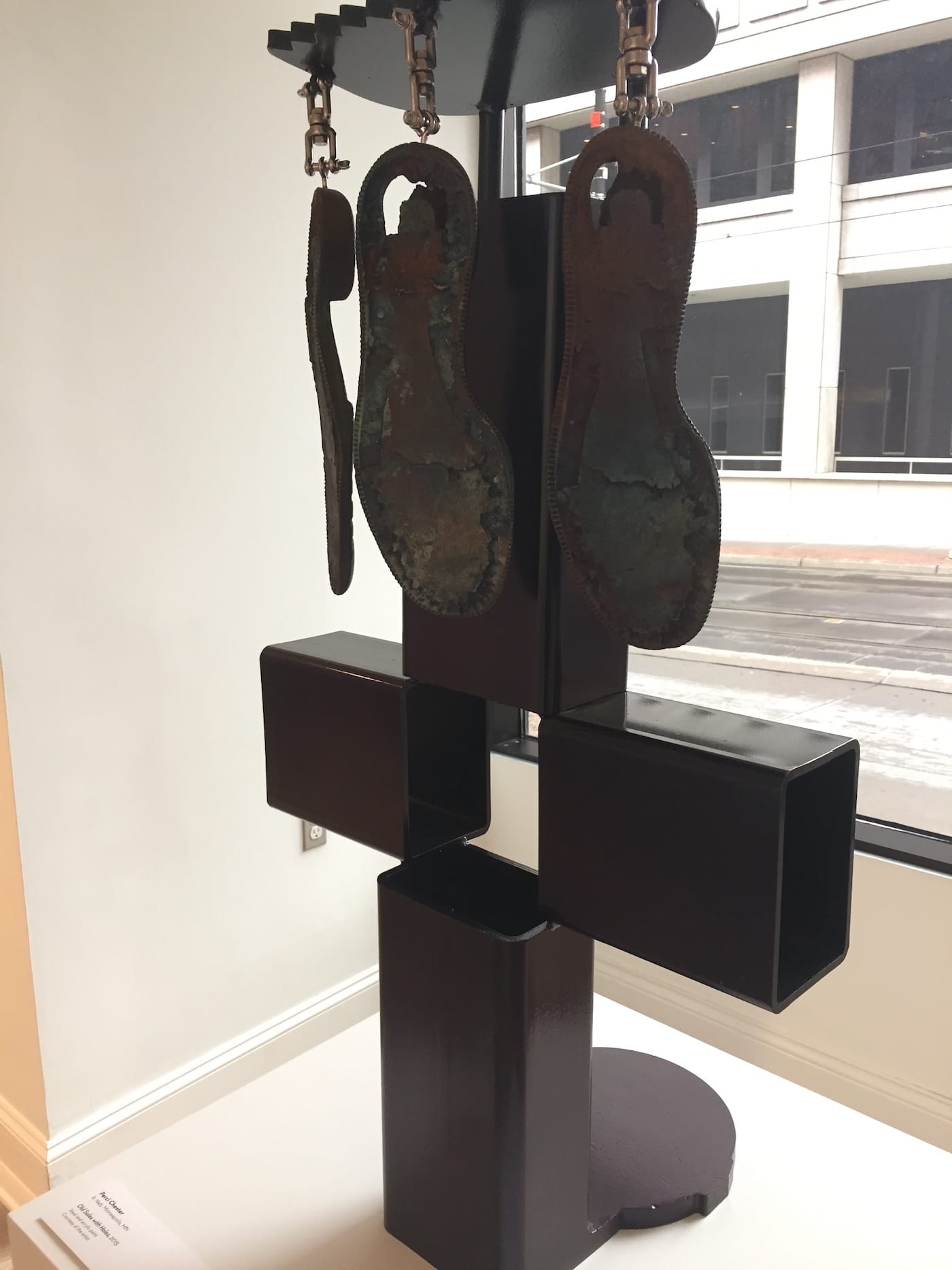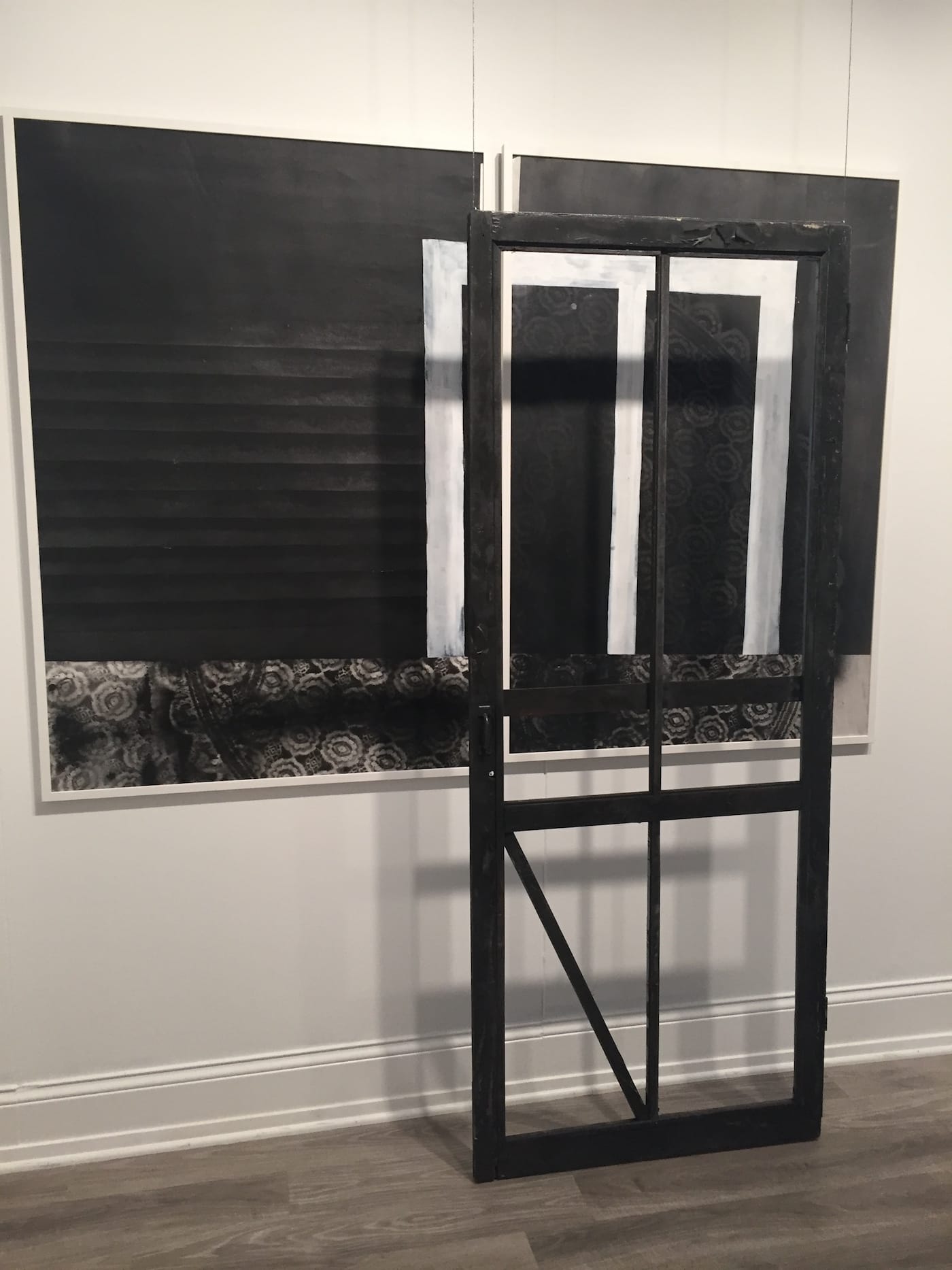 The final curator, Christopher Harrison, adds an element of abstraction into the mix, choosing works that investigate form as much as content. Tia-Simone Gardner’s installation “Slap!” (2017) features the frame of a screen door standing about a foot in front of a large piece of paper, where a reverse shadow of the door is apparent, plus added textures of perhaps a crocheted table cloth. The work evokes notions of home and safety but also hints at violence. James Maurelle’s intriguing sculpture, “Nile” (2014), constructs copper pipes into a stately form. He transforms objects that usually lie beneath the earth into a moment of beauty, and in doing so, alludes to the labor associated with people than install and clean such pipes. It’s as if he is attempting to upend hierarchies with his work.