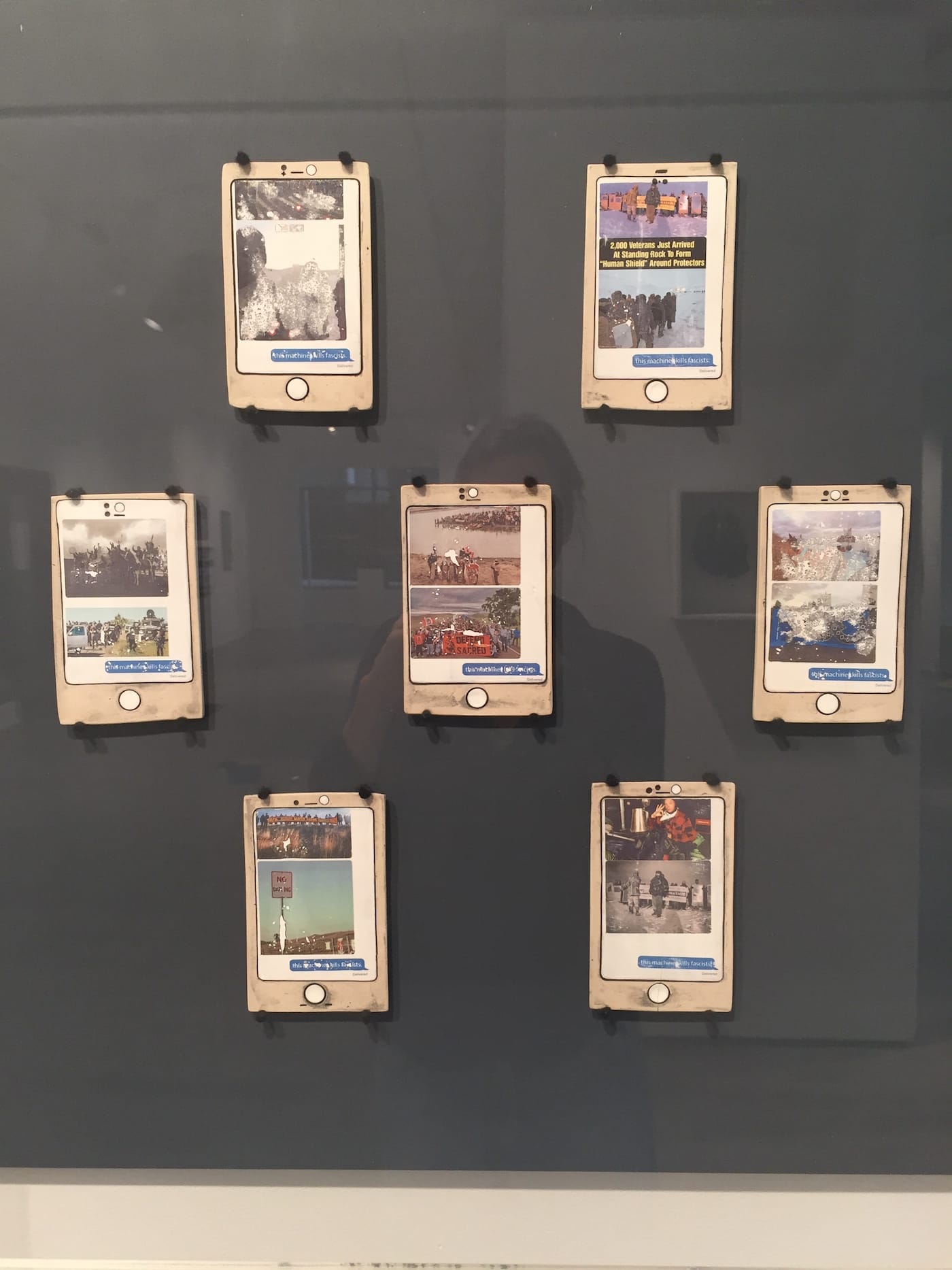 Cannupa Hanska’s “The Weapon Is Sharing (This Machine Kills Fascists)” (2017), selected by Thompson, offers a bit of a tongue-in-cheek take on the ephemeral nature of documentation, particularly within a resistance movement. Hanska transfers what appear to be cell-phone photographs of Standing Rock onto ceramic tiles, giving the social media–type images permanence and critiquing the notion of art that “stands the tests of time,” suggesting that a snapshot holds just as much value as a more permanent structure.