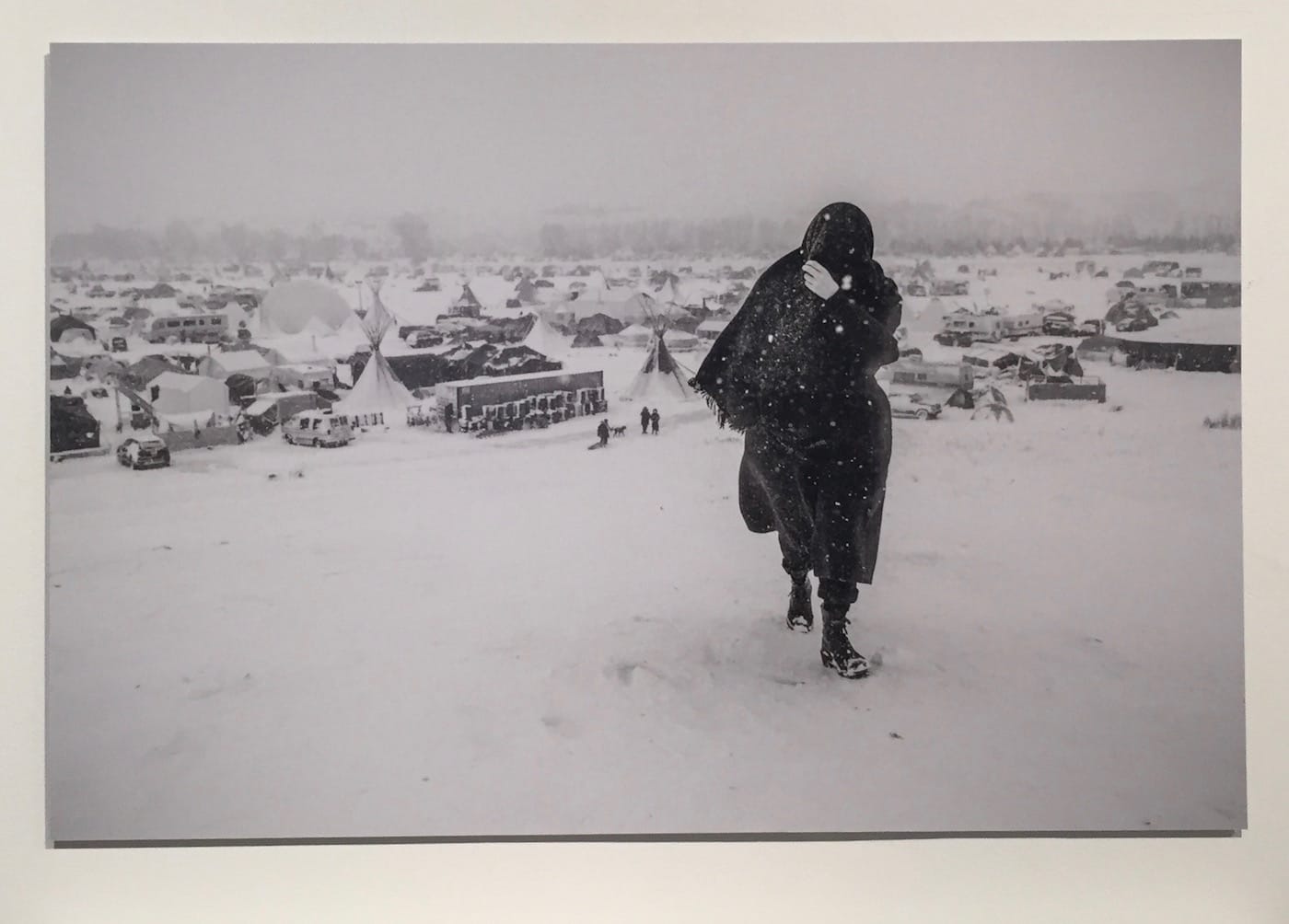 For this exhibit, both curators chose artists who represent current struggles that face Native people. Among Quiroz’s selections are Josue Rivas’s “Standing Strong” (2016), a stark photograph of a scarf-wrapped figure standing on top of a hill, with an encampment in the background. The image captures the harsh conditions that faced the water protectors for months as they camped on the banks of Cannon Ball River in hopes that they could stop the Dakota Access Pipeline from being installed.