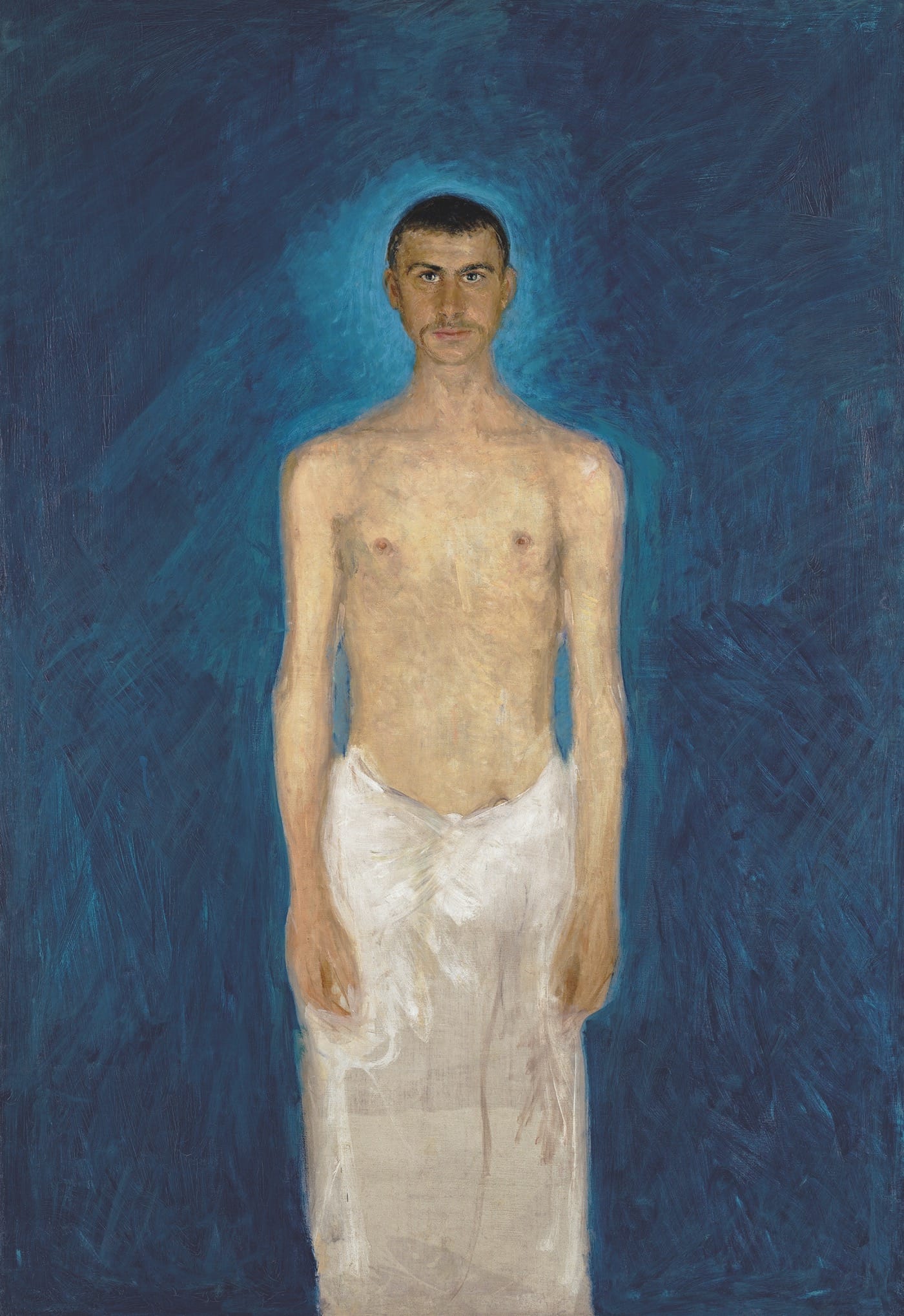 Gerstl’s retrospective at the Neue Galerie is organized thematically rather than chronologically, and, upon accessing the third floor of the Neue Galerie, the viewer first gets acquainted with the influences on Gerstl’s style by entering a room displaying photographs. In this room are one portrait of Gerstl, and portraits and self-portraits painted by Gerstl. Seeing these it becomes apparent that, rather than aligning with the fashionable Jugendstil (the German version of Art Nouveau, an art movement inspired by natural form and structure that was exceptionally popular from 1890 to 1910), he drew from the likes of Edvard Munch (for example, the “Portrait of Stanislaw Przybyszewski,” (1895), Vincent van Gogh, whose letters, translated into German in 1906, contributed to the “Expressionist” mystique around the Dutch painter, and Ferdinand Hodler. The centerpiece of this room is his “Seminude Self-Portrait”,” painted between 1902 and 1904. It depicts a seminude Gerstl standing against a blue backdrop wearing a loincloth and emanating a nimbus of blue light, his gaze direct and unavoidable — Lazarus and Christ are similar figures who first come to mind. Symbolist at a superficial glance, “Seminude Self Portrait” both alludes to and breaks from tradition: while his face is rendered in a realistic manner, his body is unnaturally slender and elongated. Diethard Leopold, in his essay published in the catalog accompanying this exhibition, equates the combination of realistic portrait and unnatural physique with the aesthetic that David Bowie would use to careen into mainstream culture in the 1970s.