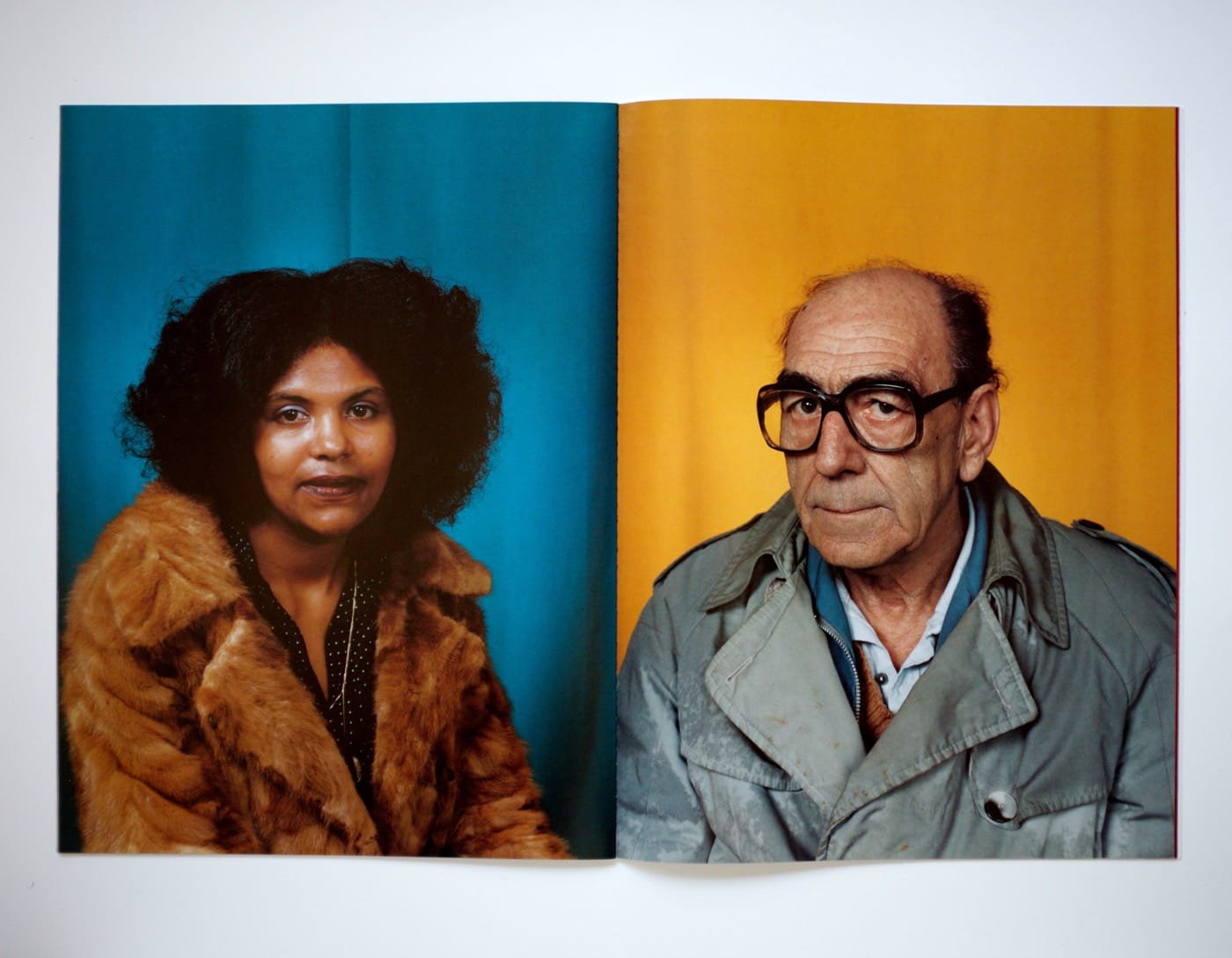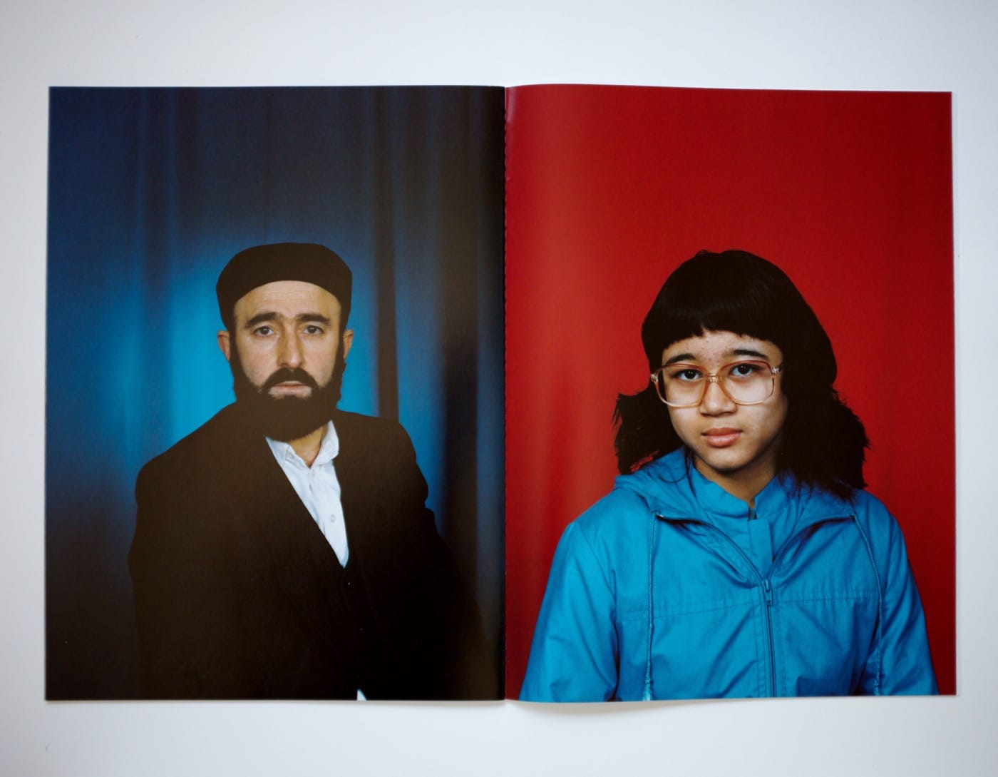 On one page there is a striking diptych, which, on the right, has a portrait of a teen girl in a blue windbreaker in front of a bright red background. She has a mullet, large glasses, and zits between her eyebrows, like a character straight out of Freaks and Geeks. She also has the unmistakable gaze of a girl who knows she’s being looked at and likes being seen, looking back at the camera with the hint of a timid smile. On the left, a serious looking man stares into the distance in front of a blue backdrop that echoes the color of the girl’s jacket.