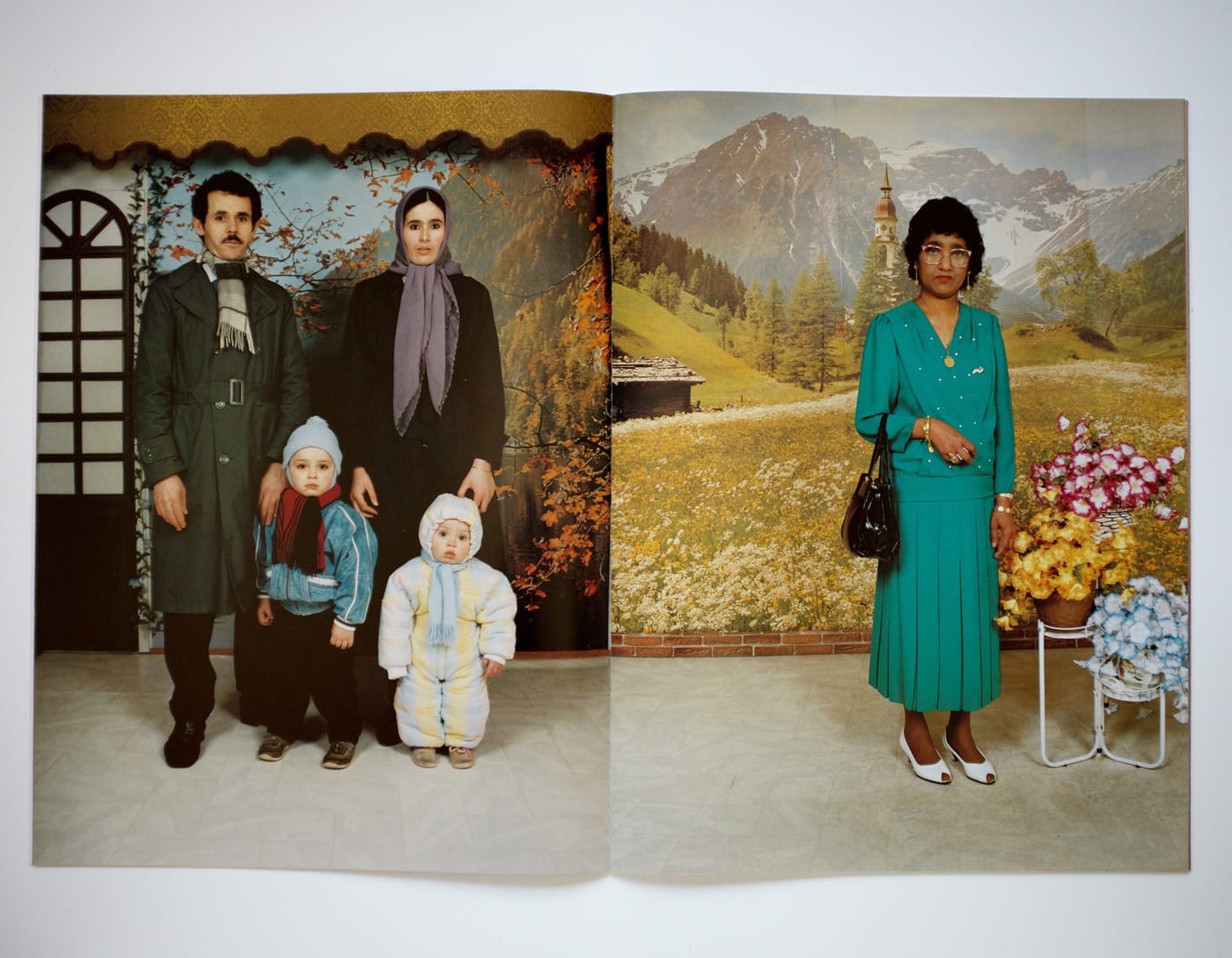 In another photo, a middle-aged woman dressed in a bright teal dress and low white heels stares at the camera, jewelry glinting at her wrists. Behind her is a faded, floor-to-ceiling backdrop of the Swiss Alps. In her right hand, almost unnoticeable, is a balled up tissue that she seems to have forgotten to stash in her purse. It looks almost expertly left in — a detail the best screenwriter might have forgotten to include in her script.