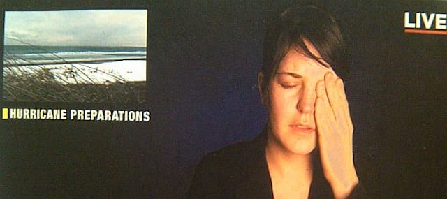 Similarly, Lori Felker’s four-channel video piece starts out as an exact replica of the look and design of a news channel when reporting a natural disaster. It has the “breaking news” chyron, the scrolling news feed at the bottom of the screen, and a photo inset with the caption “Hurricane Preparations.” Facing the camera is the artist, addressing an invisible interviewer as if recounting her firsthand experience of a storm, an account that gradually spins out of control into a free-association description of her dreams, which the artist describes as an “interpretive performance.” At another time this might seem merely clever in a conceptual way. But after the carnage from Hurricane Sandy a few weeks ago, the piece takes on a compelling quality that speaks to the anxiety we all feel when faced with the results of natural forces that we cannot possibly control.