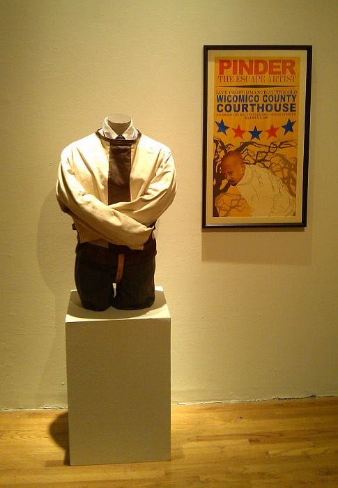 Jefferson Pinder’s “Escape Artist” is a video of the artist (who is African American) being wrapped in a straitjacket, climbing a ladder to attach himself to a rope thrown over the lower branch of a tree, and then struggling to escape from his restraints while he spins in the air. It brings you up short, like a hard slap in the face, when you discover that Pinder performs this ritual at the historical site of lynchings. The combination of reenacting a grotesque murder with a staple trick of escapologist Harry Houdini creates a spellbinding, sickening, and ultimately moving spectacle.