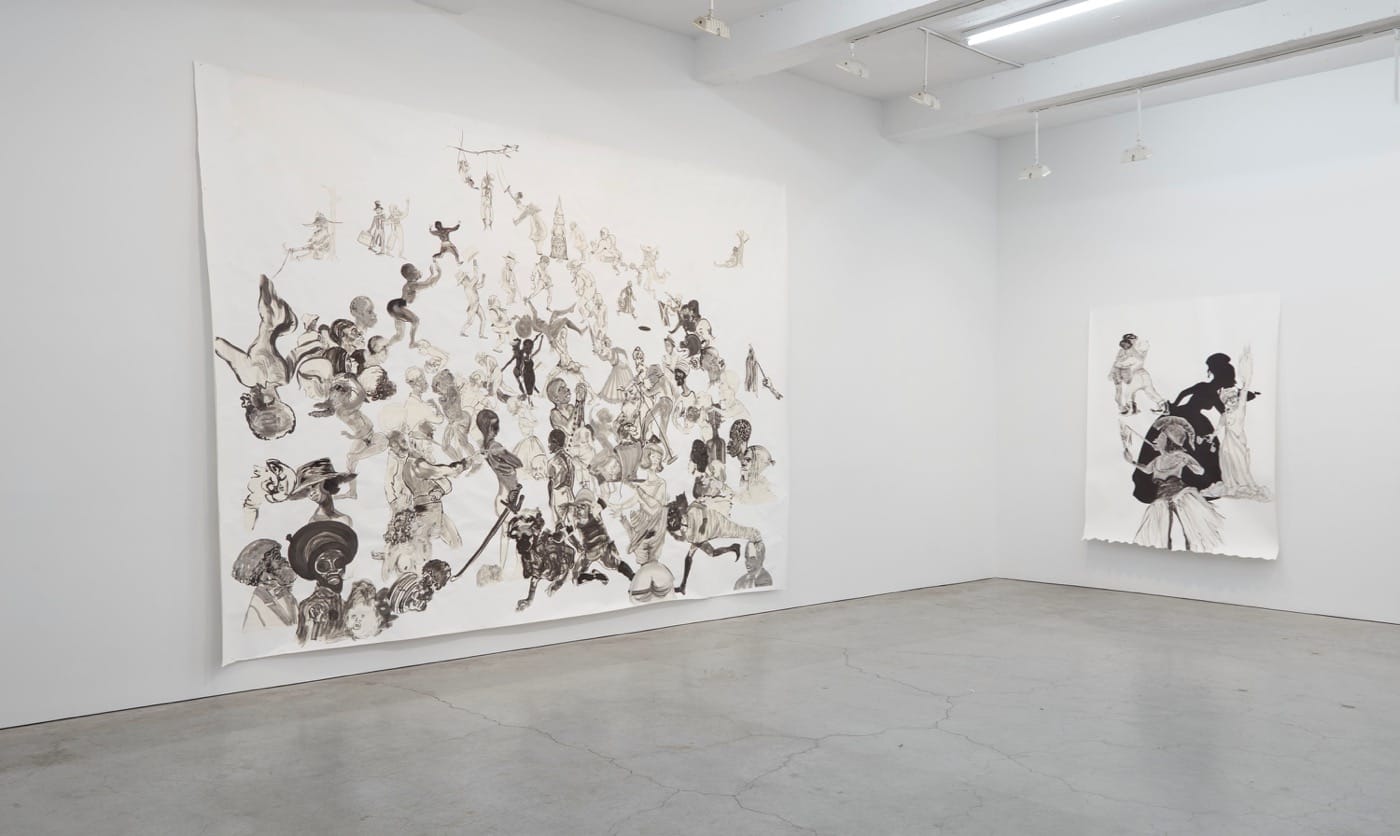 Then I realized after my piece had been edited and was being titled that I had left out a key artist in that first gallery: Julie Mehretu. This omission is particularly awful because at the end of my review I do call out the exhibition for being too male centric in the final gallery — while Mehretu was the only woman artist included in the first one. What’s worse is that in an older article that I had written about a current generation of Black artists using the language of abstraction to assert a political identity, I had failed to mention the influence of Mehretu. In fact, my former MFA professor Daniel Martinez told me after that piece was published that I should have discussed Mehretu because he believes she has had a profound effect on younger Black artists working with abstraction now.