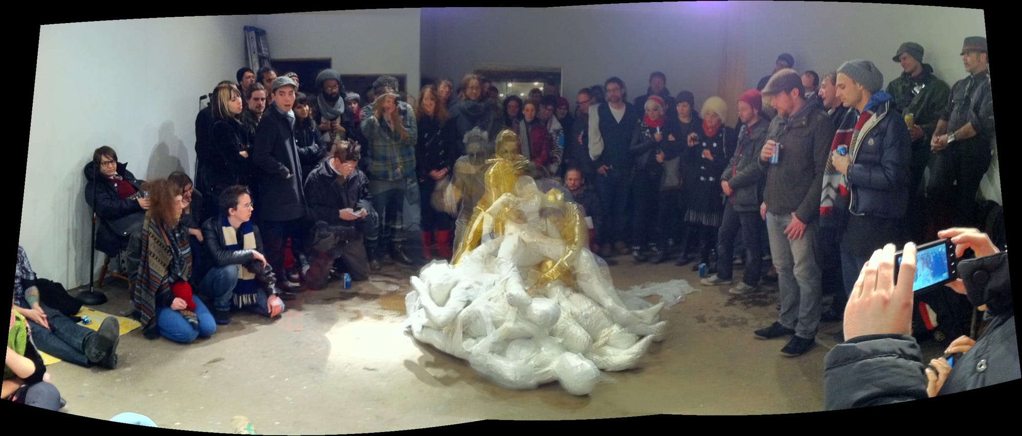 From my vantage, intermittently standing on a chair to see over the crush of spectators, I was so overwhelmed with the spectacle of the two girls in a single golden stretch suit and golden face paint stabbing bodies with golden knives that I couldn’t discern any particular symbolism. I think what prevented me in particular from making readings of genocide and communities banding together against others that other viewers did was the visual noise of the materials and the choreography of the performance. The all-over sparkly gold was so over the top, more American Apparel ad than political commentary, and the violence so exaggerated (by the end newspaper was flying everywhere and globes of green goop exploded on the floor. Souls?) that it became more about the image than the social critique. Though I see where the symbolic reads are coming from now, the whole thing hasn’t grown on me much. Part of the risk of a work of art you can only see live once is that possibility that some viewers won’t see it very well, especially in a crowd like this. It happens.