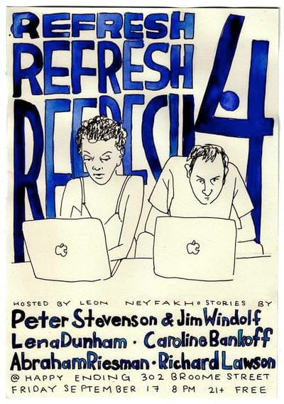 Now it’s time to hit refresh for installment number four. The posters for the event are designed by the talented Aurora Andrews but there’s another art somebody in the mix, Lena Dunham of Downtown Delusional Divas … I can only imagine what her contribution will be.