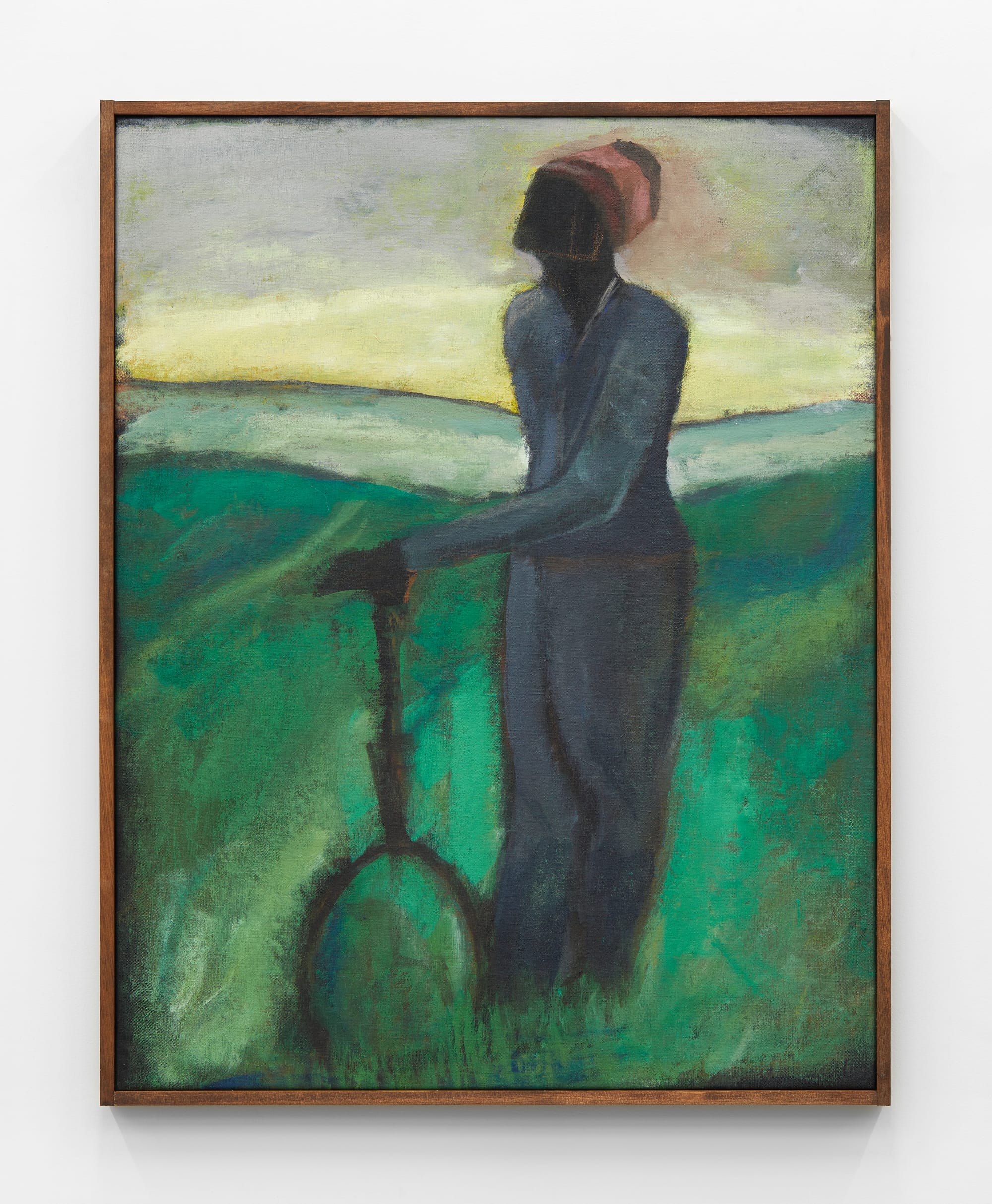 Although Hodges was born in densely populated Compton, CA, he currently resides in Lewiston, Maine, a town more sparsely inhabited, where he is attuned to the earthy pastels of quaint rural New England landscapes. Works such as “On the Verge: Green Field” (2020) reflect the gentle tensions that illuminate Hodges’ practice: his impressionistic style dwells somewhere between abstraction and figuration, evoking the history of Western portraiture by foregrounding the figure but depart from tradition by omitting all facial features.