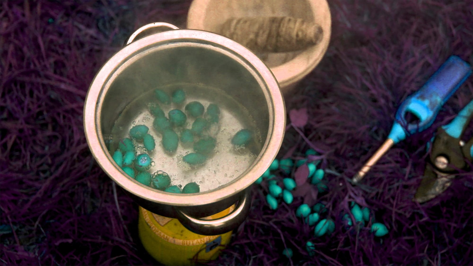 Jupiter in Aries, Moon in Virgo takes it name from the planetary signs for Sajid, a 44 year old Pakistani Muslim (and Zaman’s older brother) in “Your Ecstatic Self” (2019). (Tellingly, he’s a Leo: a “performer when it comes to sexuality.”) Commissioned for Independent Cinema Office’s “Second Sight” film program (2020) — which revisits the legacy of the 1980s UK Black Film Workshop Movement — the 33-minute experimental documentary centers a car ride conversation on Sajid’s Islamic faith. Namely, how his turn to Tantra finally aligned his spirituality with sexual liberation after years as a strict Sunni Muslim. Zaman’s work often uses conversation or a personal relationship as a starting point to weave fragmented narratives. Here, the front-seat confessional is intercut with archival footage of pre-Islamic shamanistic rituals in Pakistan’s Hunza Valley, contextualizing the barriers Sajid has faced in embracing ecstatic states often gate-kept for white touristic consumption. Meanwhile, saturated, LomoChrome Purple-esque community gardening footage of Zaman and fellow artist Priya Jay alludes to Ingrid Pollard’s Pastoral Interlude photographic series, a reference that questions the omission of women of color from British pastoral scenes, as Chandra Frank writes.