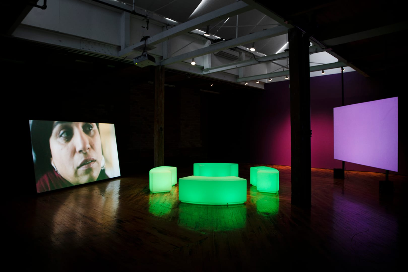 Featuring two works by the London-based moving image artist, the exhibition hones in on frequent subjects: members of her own family and diasporic consciousness rooted, in these particular cases, in South Asian experiences. Inevitably, turning the camera on one’s loved ones raises some ethical concerns — who’s truth are we, the audience, actually witnessing, and how honest is it? The exhibition seems attuned to this power dynamic, hence the intimate two-channel installation: an inviting circle of glowing, squat neon green curved benches, with projections at opposite ends, set at seated height. It cradles the unfolding family confidences, positioning the viewer literally at the same level as its non-artist film subjects.