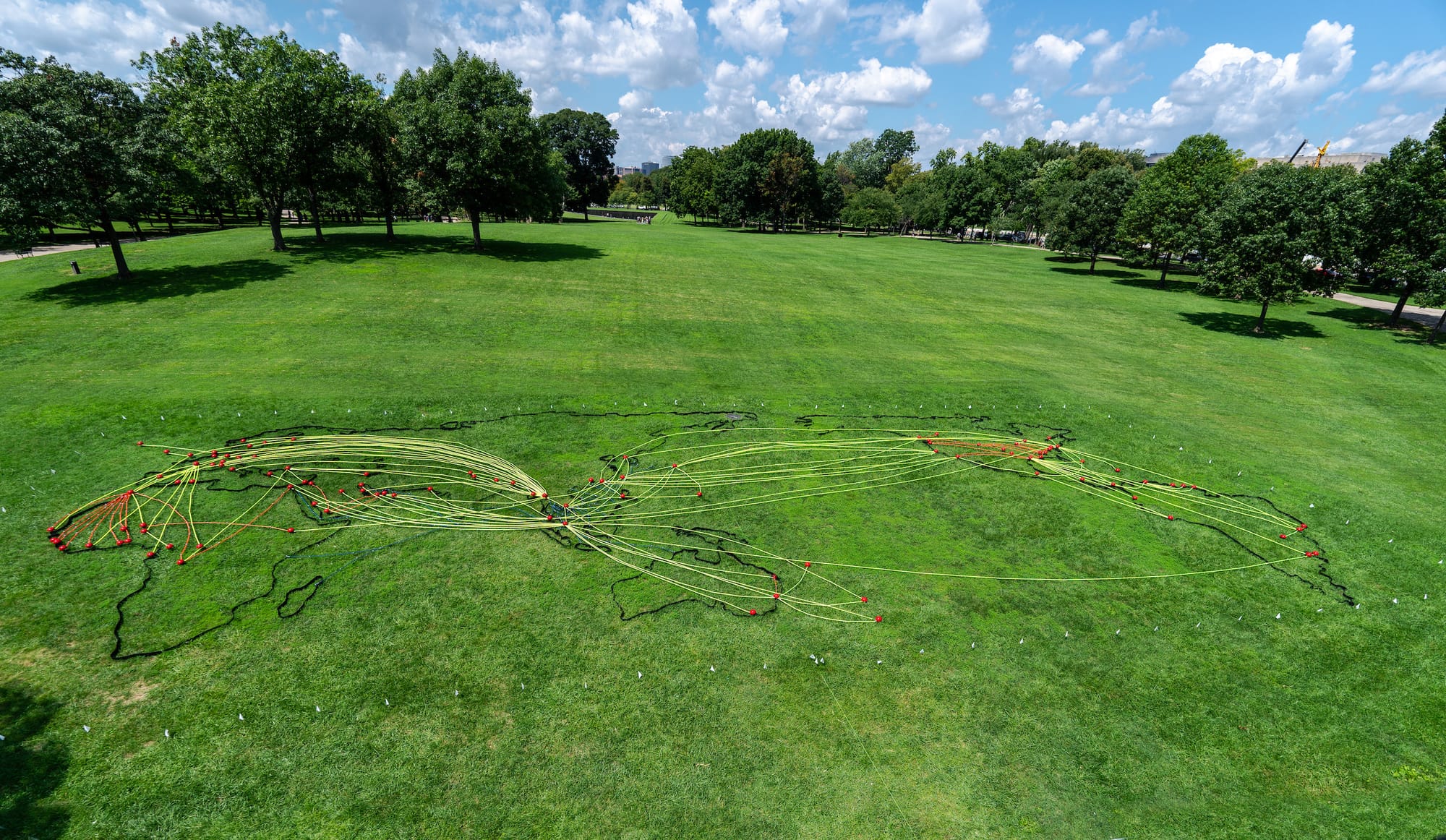 Vietnamese-American artist Tiffany Chung created a color-coded world map display of the Southeast Asian diaspora that resulted from the Vietnam War. Located within distance of the Vietnam Veterans Memorial, “For the Living” (2023) traces the boat, land, and air routes taken by refugees and immigrants with blue, orange, and yellow ropes.