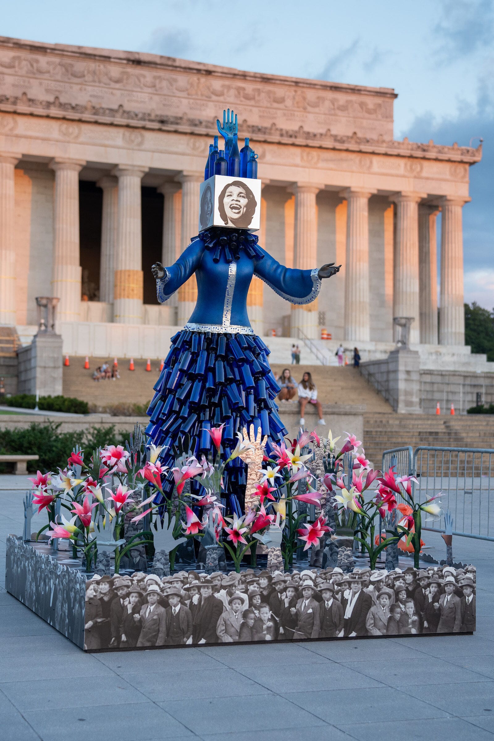 Vanessa german’s “Of Thee We Sing” (2023) also focuses on Marian Anderson’s historic performance. On the steps of the Lincoln Memorial where Anderson sang to an audience of more than 70,000 people, german created a nine-foot steel-and-resin statue of the opera singer with her image held up by a field of hands and Sandhof lilies. Notes from “Nobody Knows the Trouble I’ve Seen” detail her dress, which is a bright blue to symbolize healing.