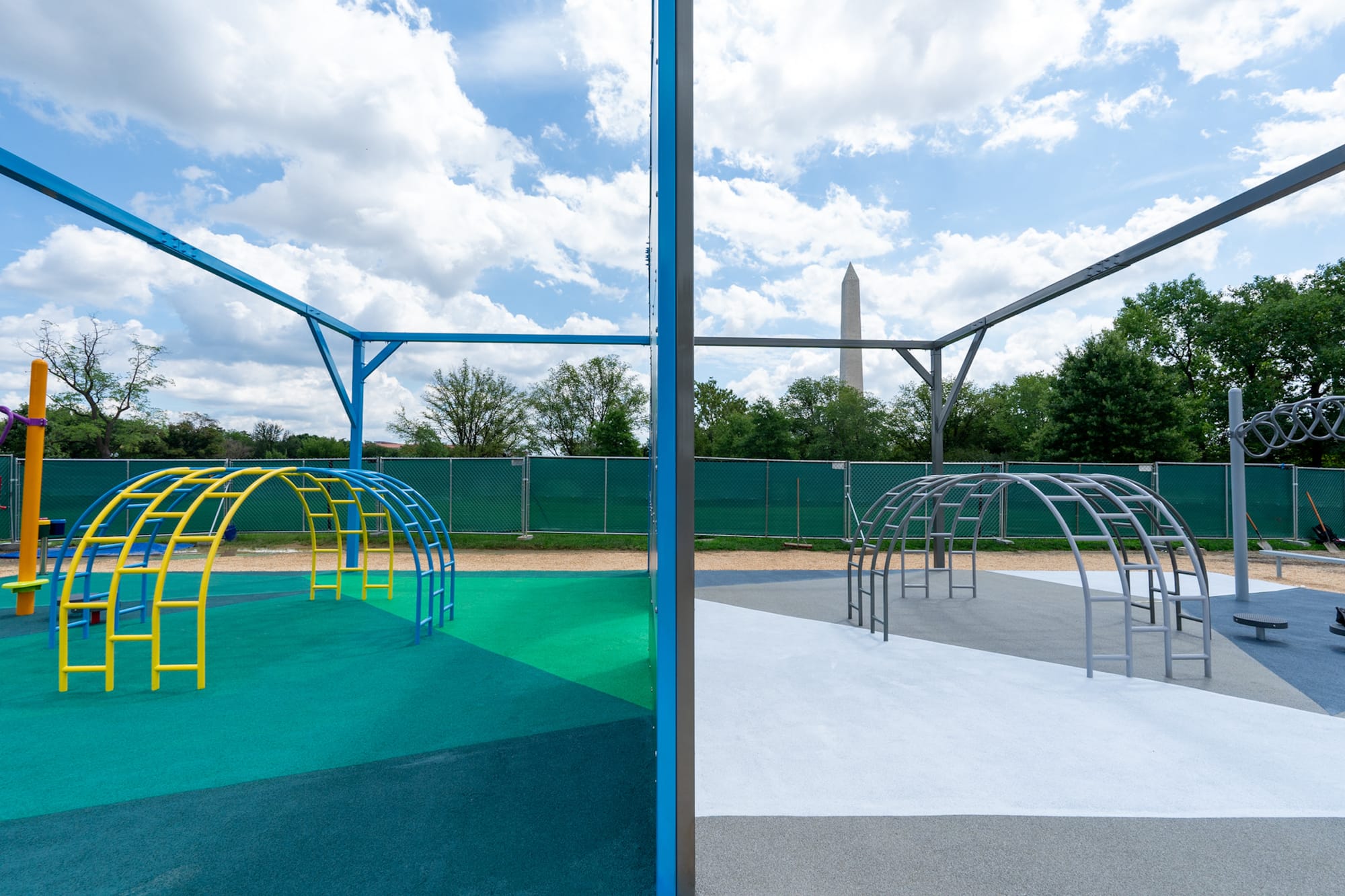 In another prototype monument by Derrick Adams, the history of racial oppression and discrimination in the US is confronted through the lens of a children’s playground. Titled “America’s Playground: DC” (2023), the structure is a fully interactive playground rendered half in color, half in grayscale. The installation is split down the middle by a blown-up archival photograph from Edgewood Park in 1954, days after the Supreme Court ruled that the capital city’s segregated schools were unconstitutional.