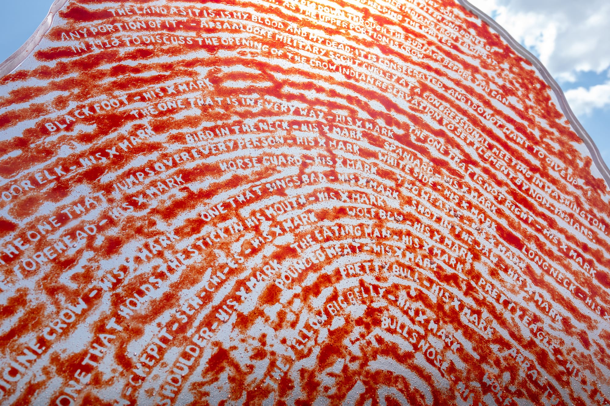 For the exhibition, Red Star created a work that grapples with the US history of Indigenous displacement and land appropriation. Using her right thumb as a model, she designed a massive red glass-and-granite thumbprint sculpture in recognition of the Indigenous leaders and representatives who signed agreements with the US government during the 19th century, which subsequently led to the relocation of Indigenous communities to unfamiliar and frequently faraway reservation lands.