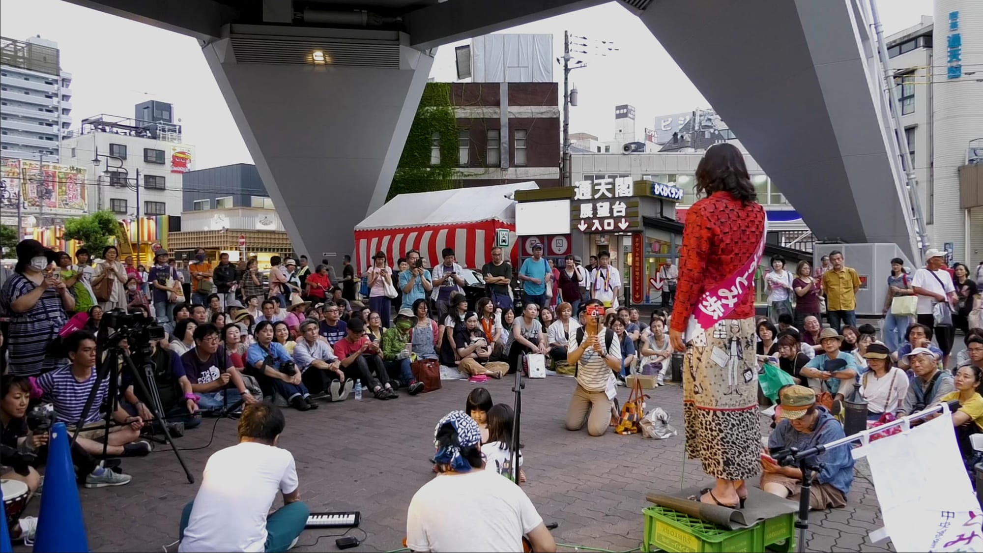 Yasutomi is not new to the Japanese political arena. In 2018, she ran for mayor of Higashimatsuyama, campaigning while riding her horse. She started to wear women’s clothes at 50, and defines herself as “woman-dressing,” a term that she coined, rather than “cross-dressing.” In the numerous street speeches documented in Reiwa Uprising, she uses captivating rhetoric to argue for structural change for “our children’s sake.” Like Okuzaki in Emperor’s Naked Army, she is unapologetic in her pursuit of her agenda, though she’s tempered by emotional intelligence similar to Takeda’s in Extreme Private Eros. She sees Japanese people as cogs in an asphyxiating machine, urging them to embrace a more sustainable pace of life. The horses that accompany her are not just distinctive props, but meant to illustrate this philosophy.