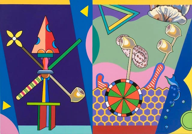 Meditating on the films of Kenneth Anger, again with Champion, Winkfield is emphatic: Anger’s “Inauguration of the Pleasure Dome,” he says, “is still the most exhilarating use (or abuse) of color I’ve ever seen in a film.” And this said from a painter whose own achievements in color are as queer and marvelous as they are uniquely bold. Winkfield continues, “For Anger and Reynaud, for Roussel and myself, ‘the work must contain nothing real.’” And it is here that we are in the heart of Winkfield’s liminal space, one fed by numerous hidden, or half-hidden streams of thought in the mind of a mystic puppeteer or self-reliant automaton. It is that counterfeit reality, which, as John Ashbery tells us, “is more real than reality.”