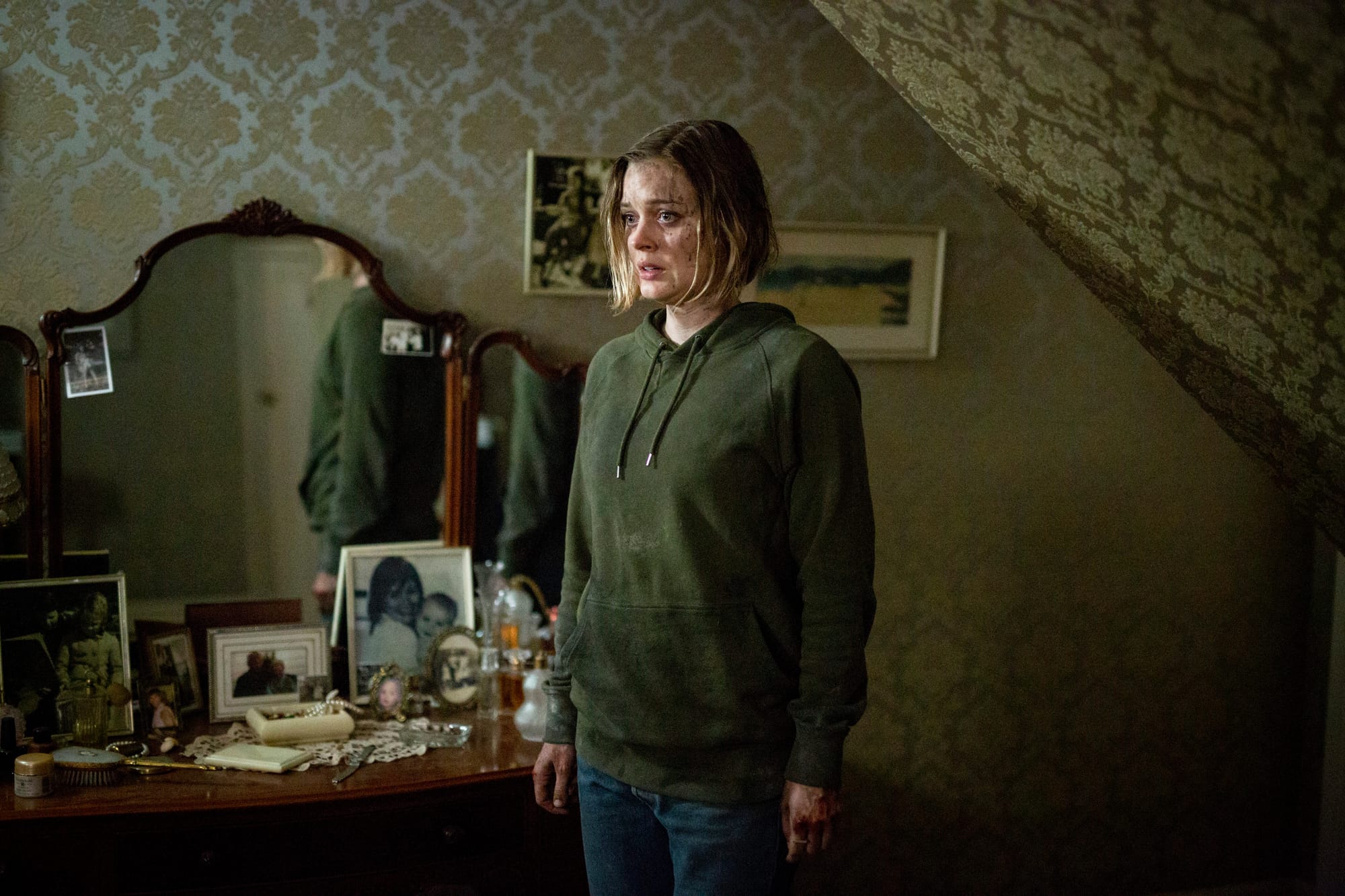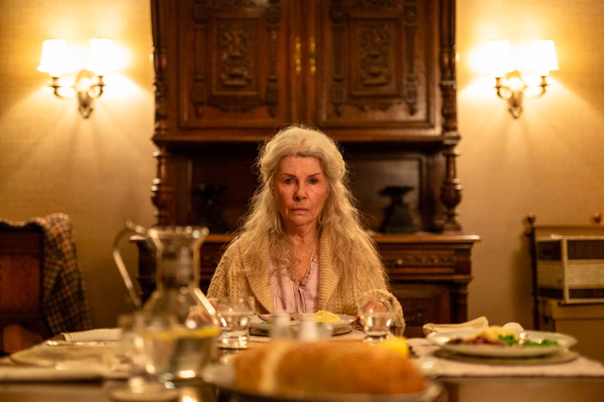 “There’s such a coldness here,” says Edna, looking off into what seem to be vacant corners in the back of the frame. The home itself feels like a rural Aussie version of Poe’s 1839 story “The Fall of the House of Usher.” Congested with hoarded bric-a-brac, dusty portraits, and creepy hand-carved candles, it slowly takes on a corporeal quality, moribund and musty. Liver-spotted wallpaper sags from the ceiling; black mold splotches the quaint stained glass. There is a dog door but no dog. Forgotten dry-clean bags crackle in the closet. Gradually, and unnervingly, the body of the domicile and that of the matriarch become one and the terrible same.